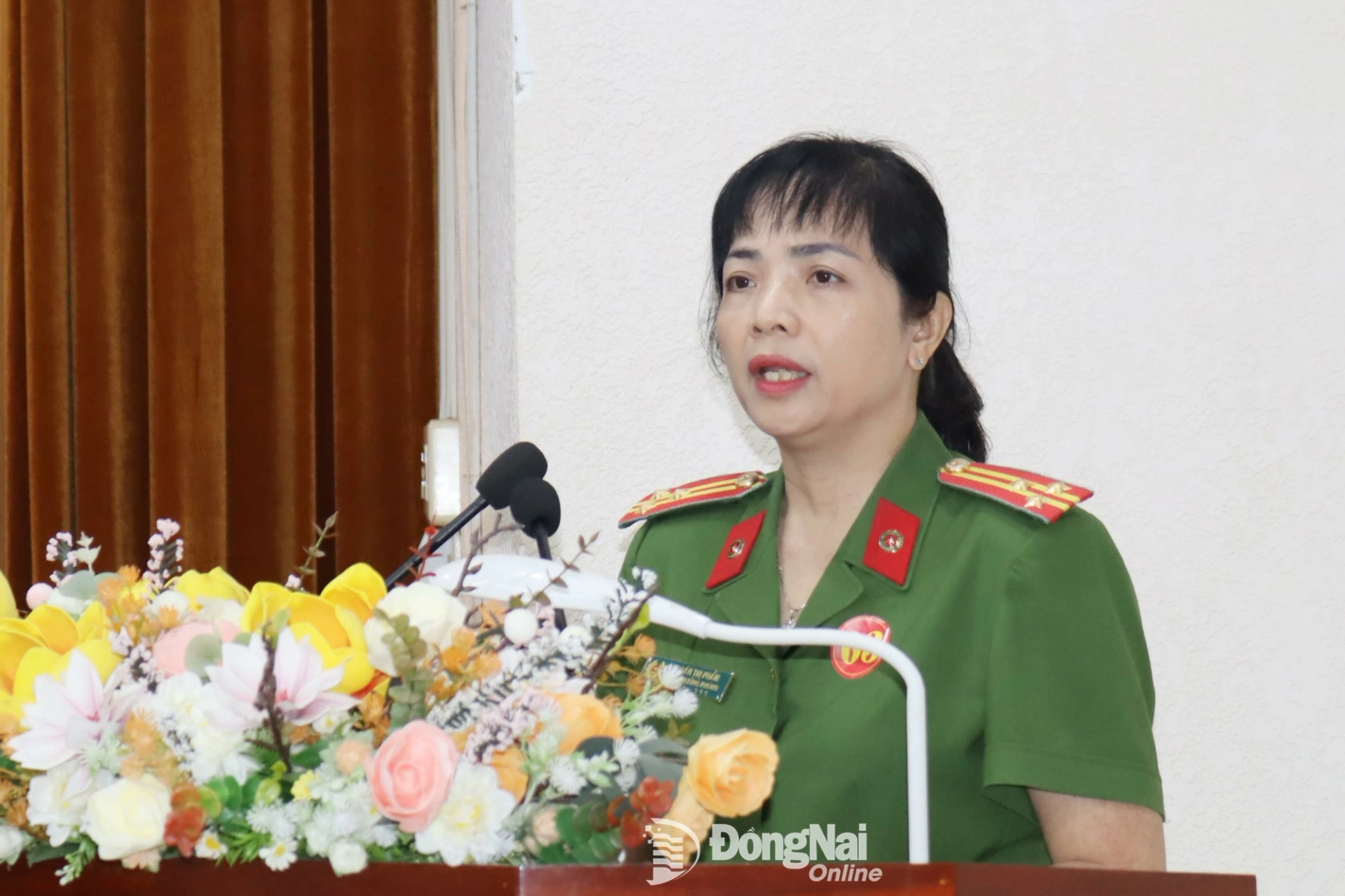 Thượng tá Đoàn Thị Phẩm, Phó Trưởng phòng Cảnh sát quản lý hành chính về trật tự xã hội Công an tỉnh Đồng Nai trình bày tham luận tại hội nghị. Ảnh: Hoàng Lộc