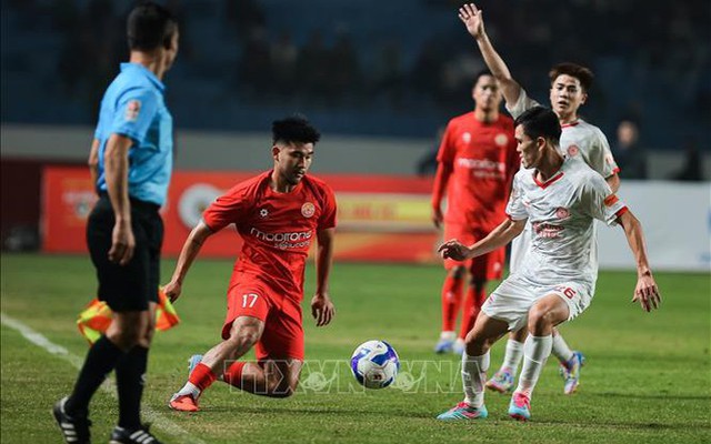 Pha tranh bóng giữa các cầu thủ hai đội Thể Công - Viettel (áo trắng) và Công an nhân dân (áo đỏ). Ảnh: Hoàng Hiếu/TTXVN
