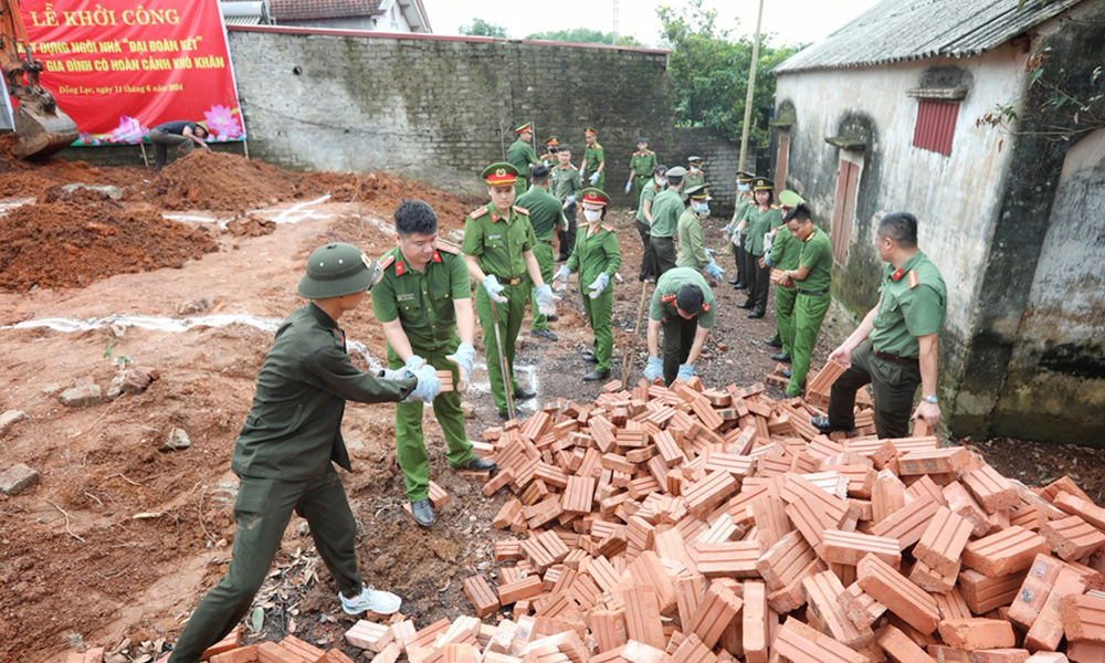 Cán bộ, chiến sĩ Công an tỉnh làm công tác dân vận, hỗ trợ ngày công xây dựng nhà tình nghĩa tặng bà Phùng Thị Thanh Thảo, xã Yên Thế. |