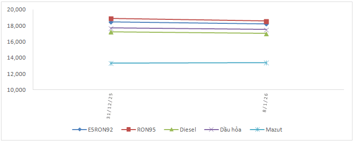 Biến động giá bán xăng dầu trong nước năm 2026 (31/12/2025 đến 08/01/2026)