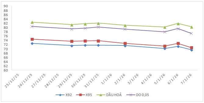 Bình quân giá thành phẩm xăng dầu thế giới giữa kỳ điều hành giá ngày 31/12/2025 và kỳ điều hành ngày 07/01/2026 là: 70,858 USD/thùng xăng RON92 dùng để pha chế xăng E5RON92 (giảm 1,095 USD/thùng, tương đương giảm 1,52%); 72,180 USD/thùng xăng RON95 (giảm 1,800 USD/thùng, tương đương giảm 2,43%); 81,144 USD/thùng dầu hỏa (giảm 0,749 USD/thùng, tương đương giảm 0,91%); 78,850 USD/thùng dầu điêzen 0,05S (giảm 1,003 USD/thùng, tương đương giảm 1,26%); 341,344 USD/tấn dầu mazut 180CST 3,5S (giảm 0,419 USD/tấn, tương đương giảm 0,12%).