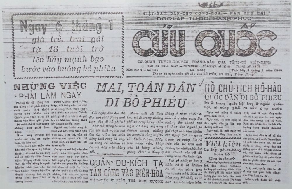 Bên cạnh Cứu quốc và Quốc hội, nhiều tờ báo không chỉ đưa tin mà còn giữ vai trò định hướng tư tưởng và lý luận sắc bén, giáo dục và cổ động quần chúng tham gia bầu cử. Trong số đặc biệt ra ngày 6/1/1946, báo Sự thật phát lời kêu gọi Nhân dân “Tất cả hãy đến thùng phiếu”. Bài báo gửi gắm thông điệp: “Ngày hôm nay, 6 tháng Giêng năm 1946, là ngày đại hội của toàn thể Nhân dân ta mà cũng là ngày đấu tranh hiếm có trong lịch sử đất nước… Chúng ta muốn dựng một nước Việt Nam Cộng hòa Dân chủ thì hôm nay đi bỏ phiếu là đặt một viên gạch xây đắp nền cộng hòa dân chủ”.