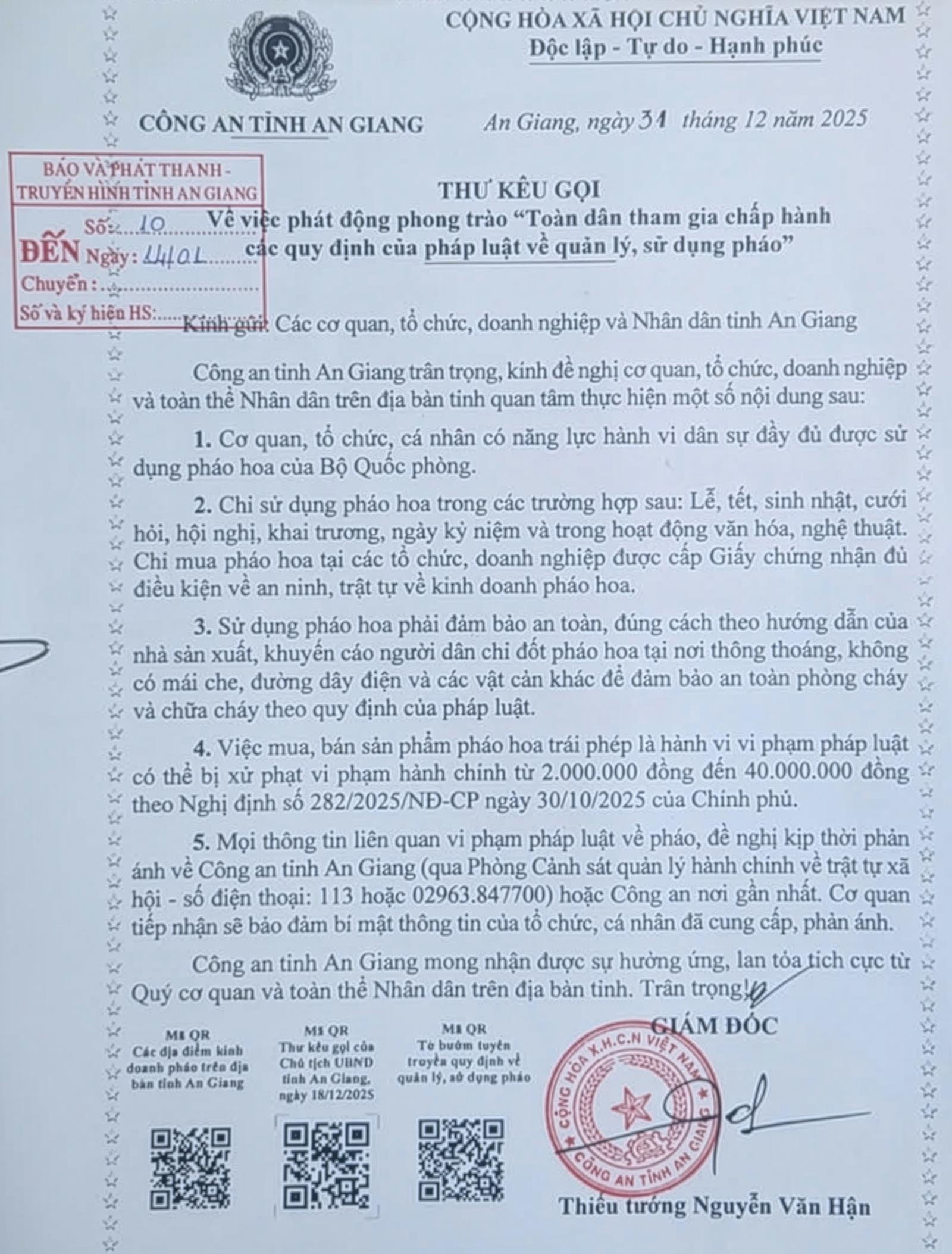 5. Mọi thông tin liên quan vi phạm pháp luật về pháo, đề nghị kịp thời phản ánh về Công an tỉnh An Giang (qua Phòng Cảnh sát quản lý hành chính về trật tự xã hội - số điện thoại: 113 hoặc 02963.847700) hoặc công an nơi gần nhất. Cơ quan tiếp nhận sẽ bảo đảm bí mật thông tin của tổ chức, cá nhân đã cung cấp, phản ánh.