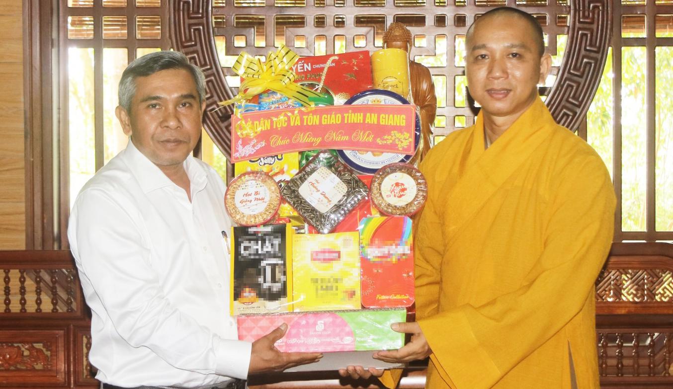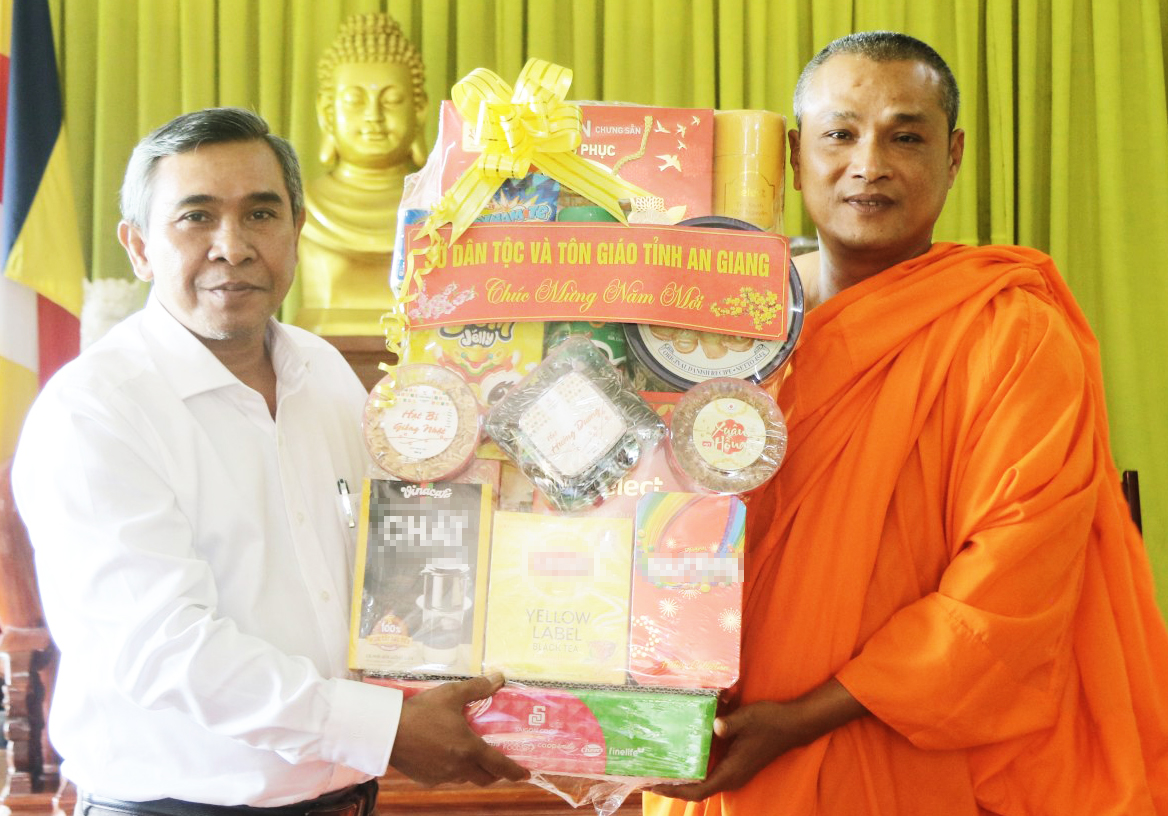 Phó Giám đốc Sở Dân tộc và Tôn giáo tỉnh An Giang Danh Lắm tặng quà đại đức Thích Thiện Định, Phó Chánh thư ký Ban Trị sự Giáo hội Phật giáo Việt Nam tỉnh, trụ trì chùa Long Khánh, xã Mỹ Đức.