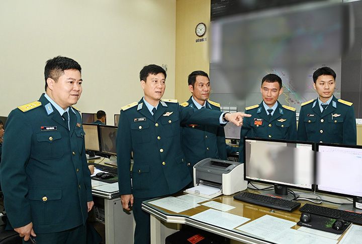 Lãnh đạo Quân chủng Phòng không - Không quân kiểm tra công tác CĐS và ứng dụng công nghệ thông tin tại Sở Chỉ huy Quân chủng.