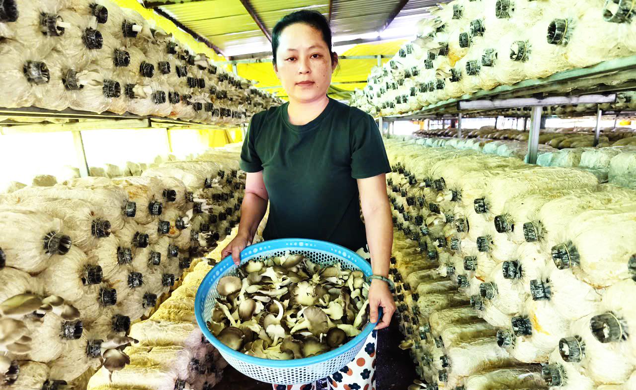 Chị Đặng Thị Diễm My thu hoạch nấm. Ảnh: BẢO NGỌC