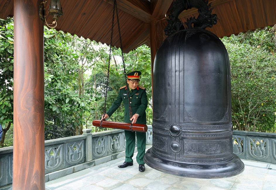 Thiếu tướng Lê Văn Thuận thực hiện nghi thức thỉnh chuông tại Đền thờ Chủ tịch Hồ Chí Minh, Khu di tích ATK Định Hóa.