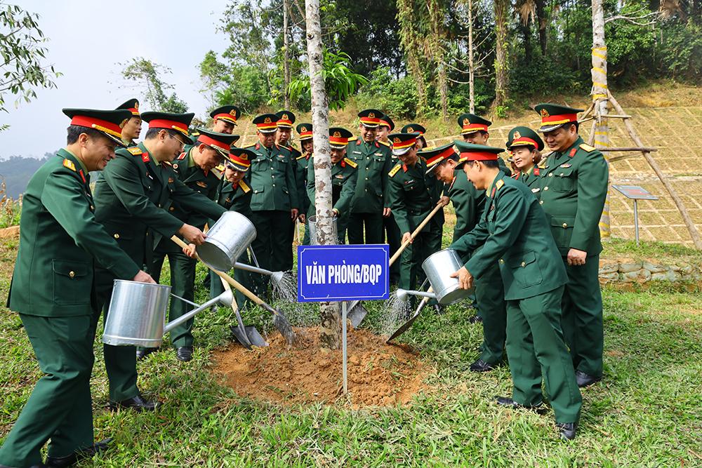 Thiếu tướng Lê Văn Thuận và đoàn công tác chăm sóc cây Kim giao của Văn phòng Bộ Quốc phòng trồng tại đồi Phong Tướng.