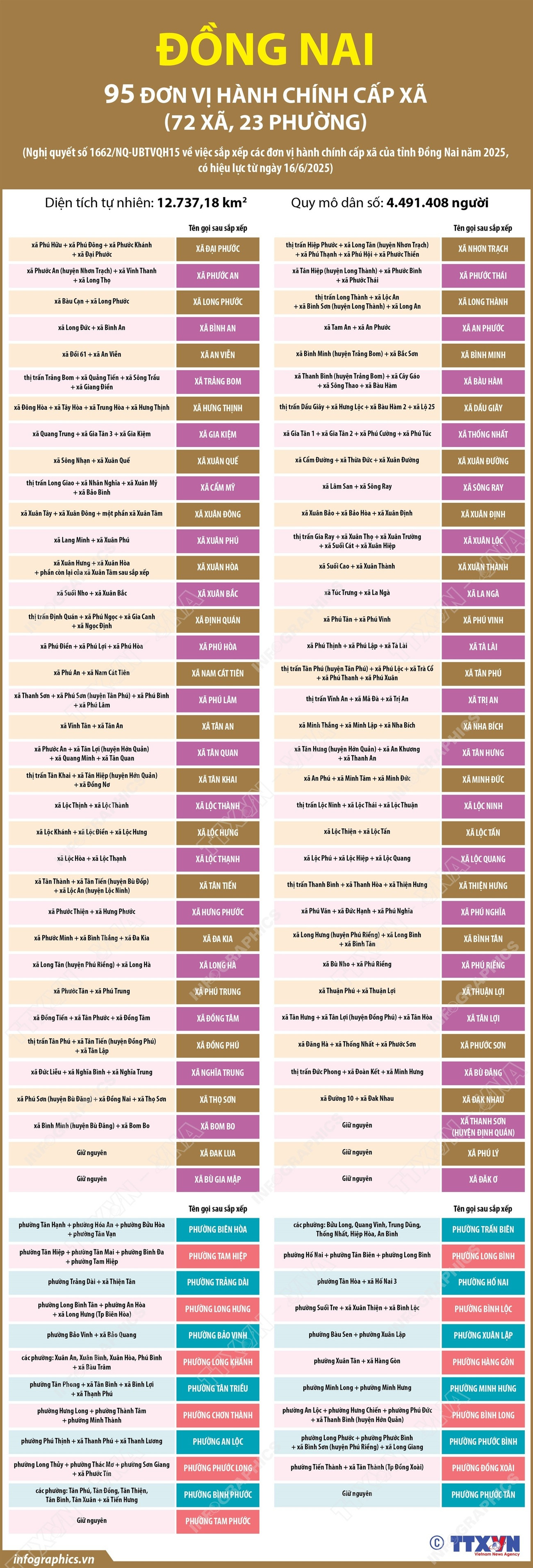 Theo Nghị quyết số 1662/NQ-UBTVQH15 ngày 16/6/2025 của Ủy ban Thường vụ Quốc hội, sau khi sắp xếp, tỉnh Đồng Nai có 95 đơn vị hành chính cấp xã, gồm 72 xã và 23 phường; trong đó có 67 xã, 21 phường hình thành sau sắp xếp quy định tại Điều này và 7 đơn vị hành chính cấp xã không thực hiện sắp xếp là phường Phước Tân, phường Tam Phước, các xã Thanh Sơn (huyện Định Quán), Đak Lua, Phú Lý, Bù Gia Mập, Đăk Ơ./.