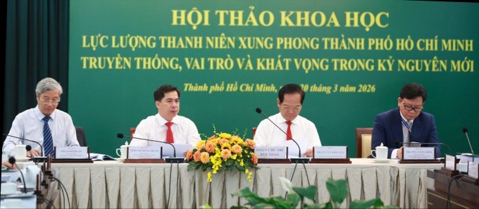 Các đồng chí chủ trì hội thảo sáng 20/3. (Ảnh: SGGP)Sáng 20/3, Ban Tuyên giáo và Dân vận Thành ủy TPHCM phối hợp Lực lượng Thanh niên xung phong (TNXP) TPHCM tổ chức hội thảo khoa học “Lực lượng TNXP TPHCM - Truyền thống, vai trò và khát vọng trong kỷ nguyên mới”.