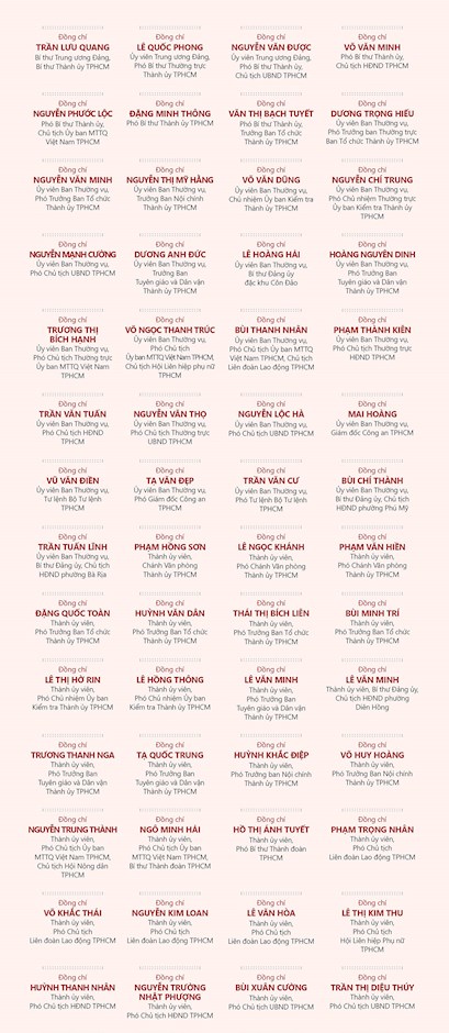 Tổng Bí thư Tô Lâm tặng hoa chúc mừng Bí thư Thành ủy TPHCM Trần Lưu QuangTại buổi lễ, đồng chí Nguyễn Quang Dương, Ủy viên Trung ương Đảng, Phó trưởng Ban Tổ chức Trung ương, công bố quyết định của Bộ Chính trị về chỉ định Ban Chấp hành Đảng bộ TPHCM nhiệm kỳ 2025-2030, gồm 110 đồng chí.