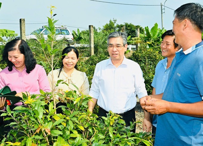 Đồng chí Nguyễn Phước Lộc khảo sát các vườn mai trên tuyến đường bờ trái Kênh 5. (Ảnh: SGGP)Đồng chí cũng ghi nhận nỗ lực của nông dân xã Bình Lợi trong việc ứng dụng khoa học - công nghệ để có sản phẩm mai trái mùa, phục vụ thành công Đại lễ Vesak Liên Hiệp Quốc năm 2025, qua đó để lại dấu ấn tốt đẹp trong lòng bạn bè quốc tế.