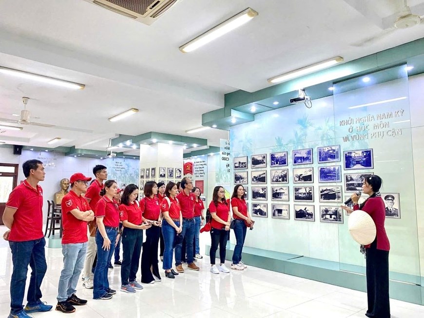 Khách tham quan nghe thuyết minh tại Nhà trưng bày Khu di tích Ngã ba Giồng.Nơi đây gắn liền với những trang sử oanh liệt của Nam Bộ kháng chiến, là “địa chỉ đỏ” in dấu chân của những chiến sĩ cách mạng kiên trung, như: Nguyễn Văn Cừ, Võ Văn Tần, Nguyễn Thị Minh Khai... Những anh hùng hiên ngang bước ra pháp trường, để lại bản hùng ca bất diệt trong lịch sử đấu tranh của dân tộc. Bước vào di tích, du khách có thể cảm nhận âm vang quá khứ qua tượng đài, nhà bia, khu tưởng niệm, hình ảnh lịch sử và những hiện vật trưng bày.