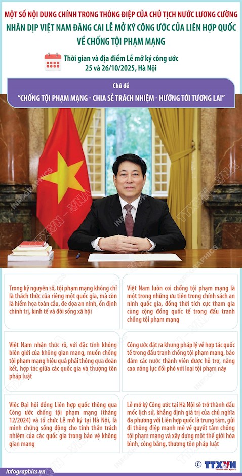 Trong Thông điệp nhân dịp Việt Nam đăng cai lễ mở ký Công ước của Liên hợp quốc về chống tội phạm mạng ngày 25-26/10 tại Hà Nội, Chủ tịch nước Lương Cường nhấn mạnh: Công ước đặt ra khung pháp lý về hợp tác quốc tế trong đấu tranh chống tội phạm mạng, bảo đảm các nước thành viên, đặc biệt là các quốc gia đang phát triển, các quốc gia dễ bị tổn thương, được hỗ trợ, nâng cao năng lực đối phó với loại tội phạm này.