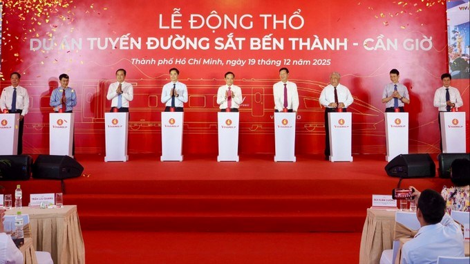 Bí thư Thành ủy TPHCM Trần Lưu Quang, Phó Chủ tịch Tập đoàn Vingroup Lê Khắc Hiệp, Giám đốc Sở Xây dựng TPHCM Trần Quang Lâm tham dự lễ động thổ Dự án tuyến đường sắt Bến Thành – Cần Giờ. (Ảnh: SGGP)Đồng chí Bùi Xuân Cường cho biết, việc triển khai tuyến đường sắt Bến Thành – Cần Giờ có ý nghĩa chiến lược, gắn với định hướng tổ chức lại không gian đô thị, phát triển mô hình kinh tế mới và nâng cao chất lượng sống của người dân. Dự án cũng là bước cụ thể hóa Nghị quyết số 68 của Bộ Chính trị về phát triển kinh tế tư nhân, tạo đột phá trong việc huy động nguồn lực xã hội, đặc biệt là nguồn lực tư nhân tham gia đầu tư các công trình hạ tầng giao thông chiến lược.