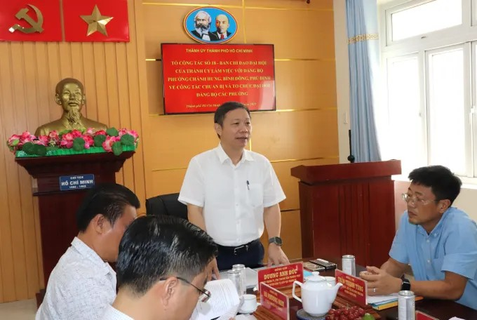 Phó Trưởng Ban Thường trực Ban Tuyên giáo và Dân vận Thành ủy TPHCM Dương Anh Đức phát biểu tại buổi làm việcNgày 1/8, Tổ Công tác số 18 của Ban Chỉ đạo Đại hội của Thành ủy TPHCM về đại hội Đảng bộ phường, xã, đặc khu và cấp trên trực tiếp cơ sở nhiệm kỳ 2025-2030, đã làm việc với Đảng ủy các phường: Chánh Hưng, Bình Đông và Phú Định về công tác chuẩn bị và tổ chức Đại hội Đảng bộ lần thứ I, nhiệm kỳ 2025-2030.