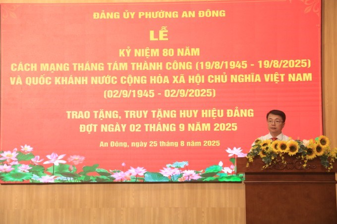 Phó Bí thư Thường trực Đảng ủy phường An Đông Phạm Nam Vĩnh An phát biểu ôn truyền thốngNgày 25/8, Đảng ủy phường An Đông (TPHCM) tổ chức Lễ kỷ niệm 80 năm Cách mạng Tháng Tám thành công (19/8/1945 – 19/8/2025) và Quốc khánh nước Cộng hòa xã hội chủ nghĩa Việt Nam (2/9/1945 – 2/9/2025); trao tặng, truy tặng Huy hiệu Đảng đợt 2/9.