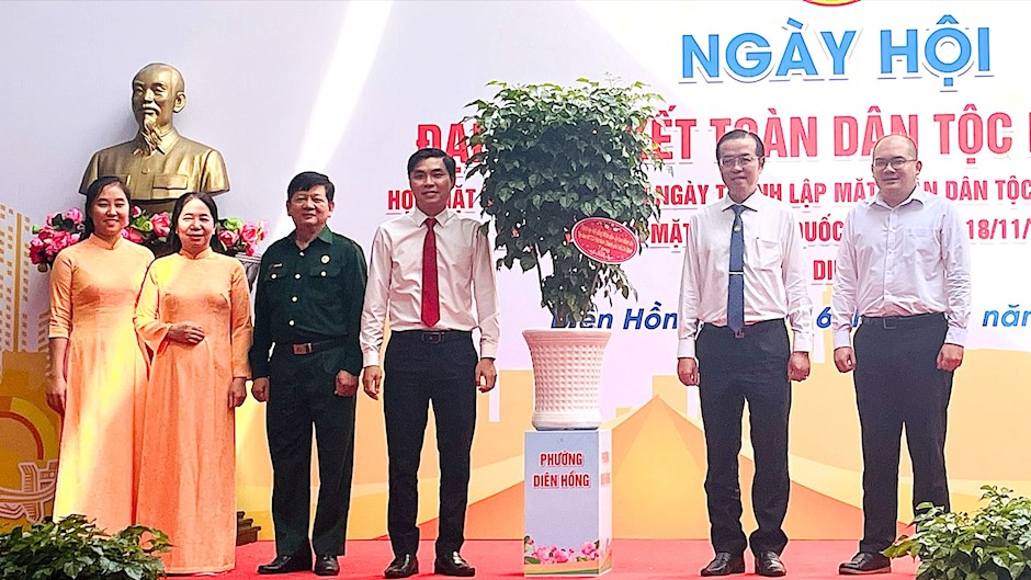 Đồng chí Lê Văn Minh (thứ 6 từ trái qua) và đồng chí Châu Trọng Nam (thứ 5 từ trái qua) trao các phần quà an sinh xã hội đến các hộ cận nghèo, hộ có hoàn cảnh khó khănTrong chương trình ngày hội, Ủy ban MTTQ Việt Nam phường Diên Hồng biểu dương 50 gương Người tốt, việc tốt tiêu biểu năm 2025; phối hợp tổ chức trao tặng 76 phần quà an sinh xã hội đến các hộ cận nghèo, hộ có hoàn cảnh khó khăn; tổ chức 18 gian hàng kết nối - hỗ trợ tiêu dùng, trao tặng 200 phiếu mua hàng miễn phí cho người dân; tổ chức bữa cơm Đại đoàn kết với 420 suất ăn ấm áp, nghĩa tình để mọi người cùng quây quần, sẻ chia, cảm nhận giá trị sâu sắc của tình làng nghĩa xóm…