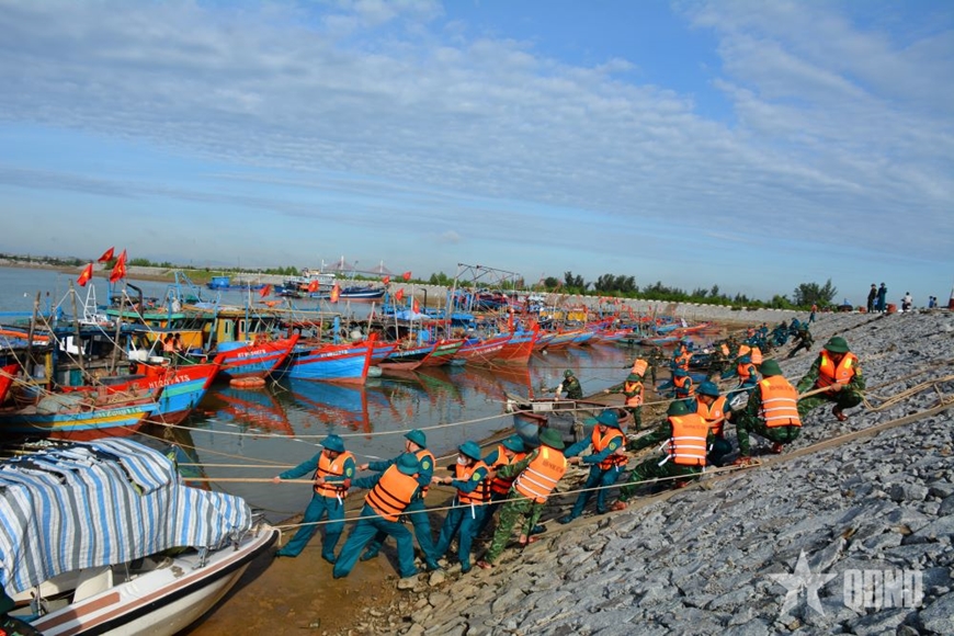 Các lực lượng chức năng giúp người dân neo đậu tàu thuyền tại Cảng cá Xuân Hội (xã Đan Hải, tỉnh Hà Tĩnh) trong bão số 5 vừa qua. (Nguồn ảnh: Báo Quân đội nhân dân).