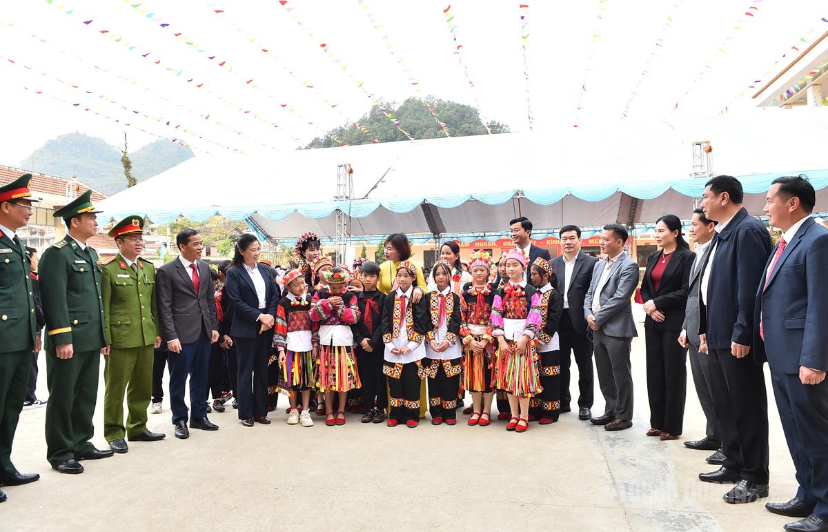 Đồng chí Phó Bí thư Thường trực Tỉnh ủy Lê Thị Kim Dung cùng các đại biểu và học sinh xã Lũng Cú tại lễ khởi công.