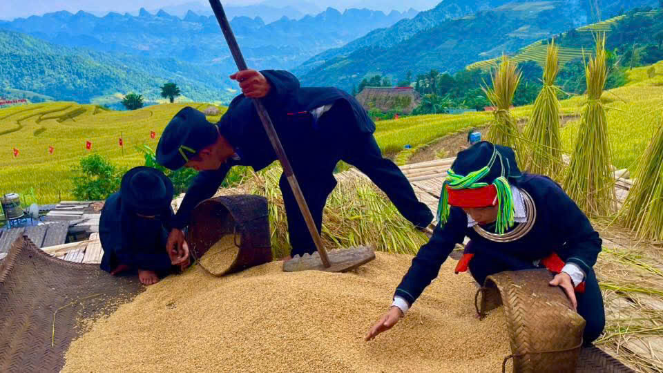Người Dao thôn Xà Phìn thu hoạch thóc ngày mùa.