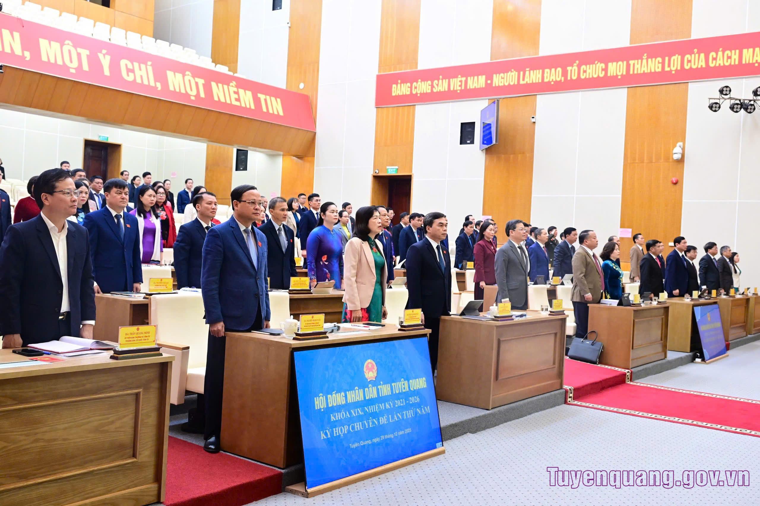 Các đồng chí lãnh đạo tỉnh và đại biểu chào cờ, hát Quốc ca tại kỳ họp.