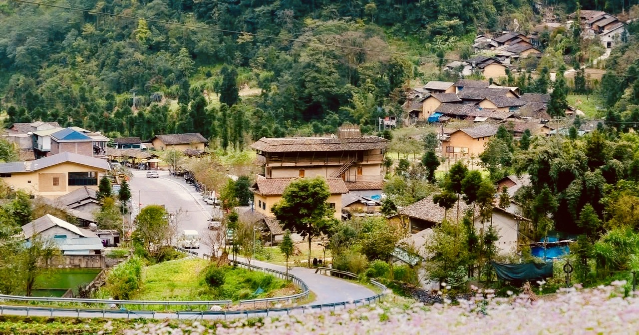 Làng văn hóa du lịch Lũng Cẩm Trên như một bức tranh tuyệt đẹp khi mùa hoa Tam giác mạch nở rộ.