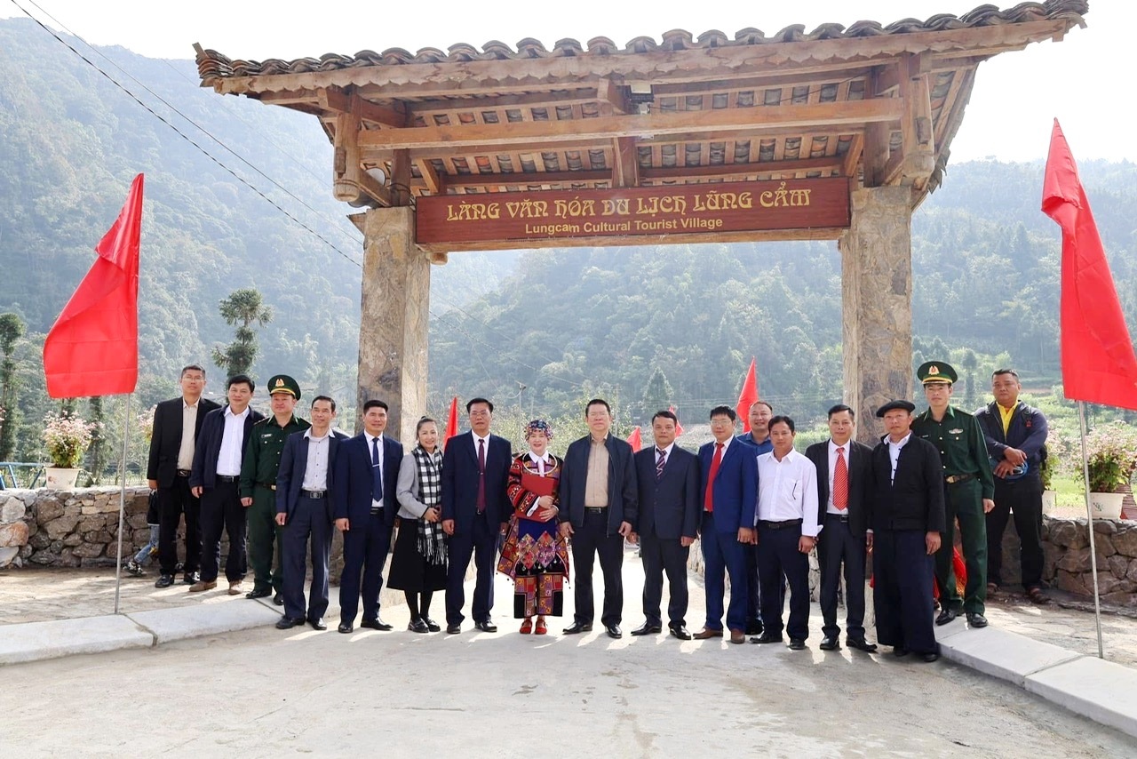 Đồng chí Trần Mạnh Lợi, Ủy viên BTV Tỉnh ủy, Trưởng Ban Tuyên giáo và Dân vận Tỉnh ủy cùng lãnh đạo các xã chụp ảnh lưu niệm lại cổng Làng Văn hóa Du lịch Lũng Cẩm.