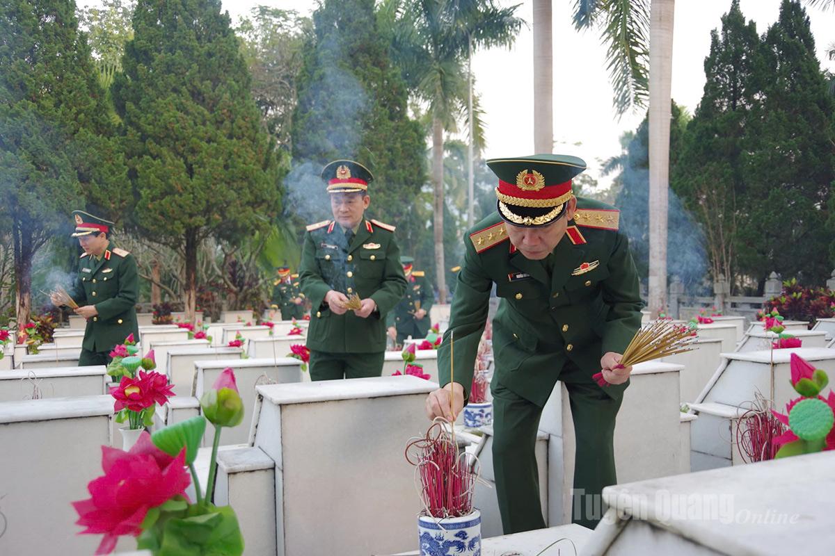Thứ trưởng Bộ Quốc phòng Nguyễn Văn Gấu và đoàn công tác Bộ Quốc phòng thắp hương các phần mộ liệt sĩ tại Nghĩa trang Liệt sĩ Quốc gia Vị Xuyên.