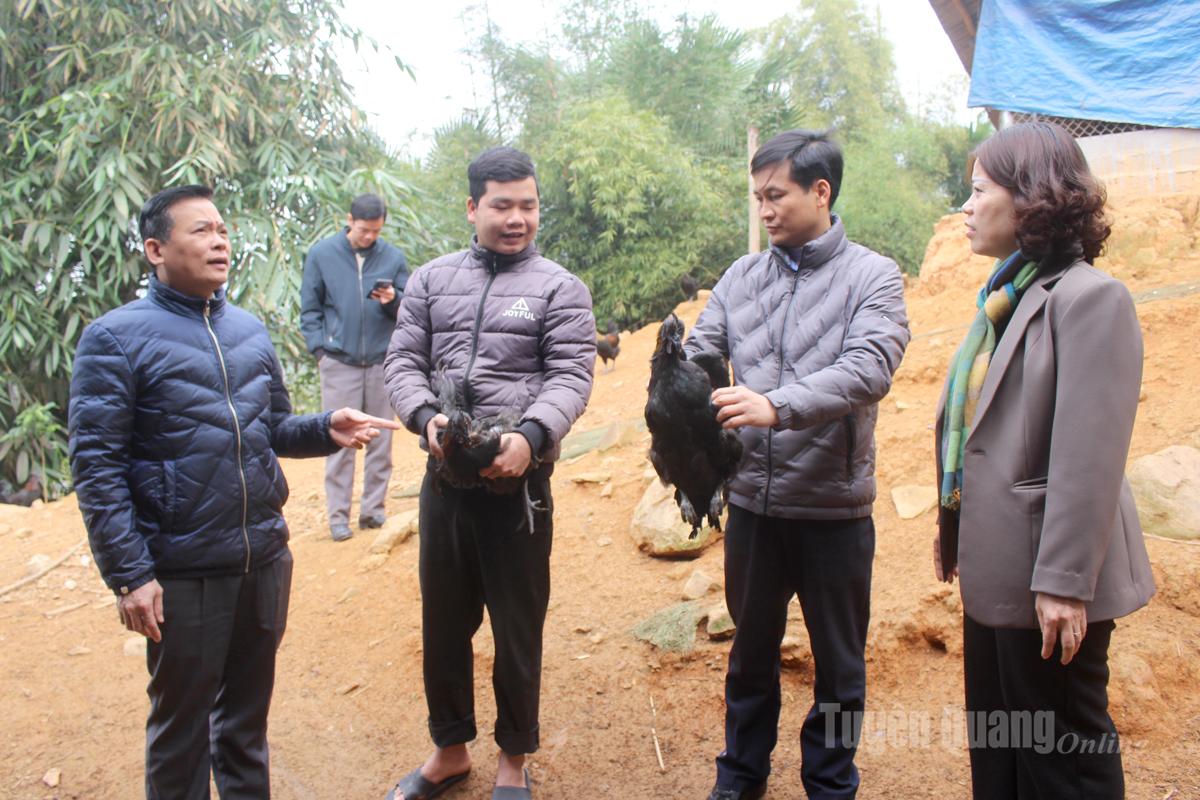 Đồng chí Lý Thị Lan tham quan mô hình nuôi gà đen H’Mông thôn Tát Cà, xã Tùng Bá.