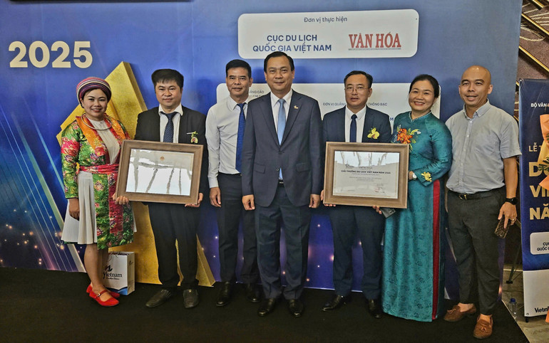 Đại diện 2 khu du lịch của tỉnh Tuyên Quang đạt danh hiệu tại Lễ trao giải thưởng Du lịch Việt Nam năm 2025.