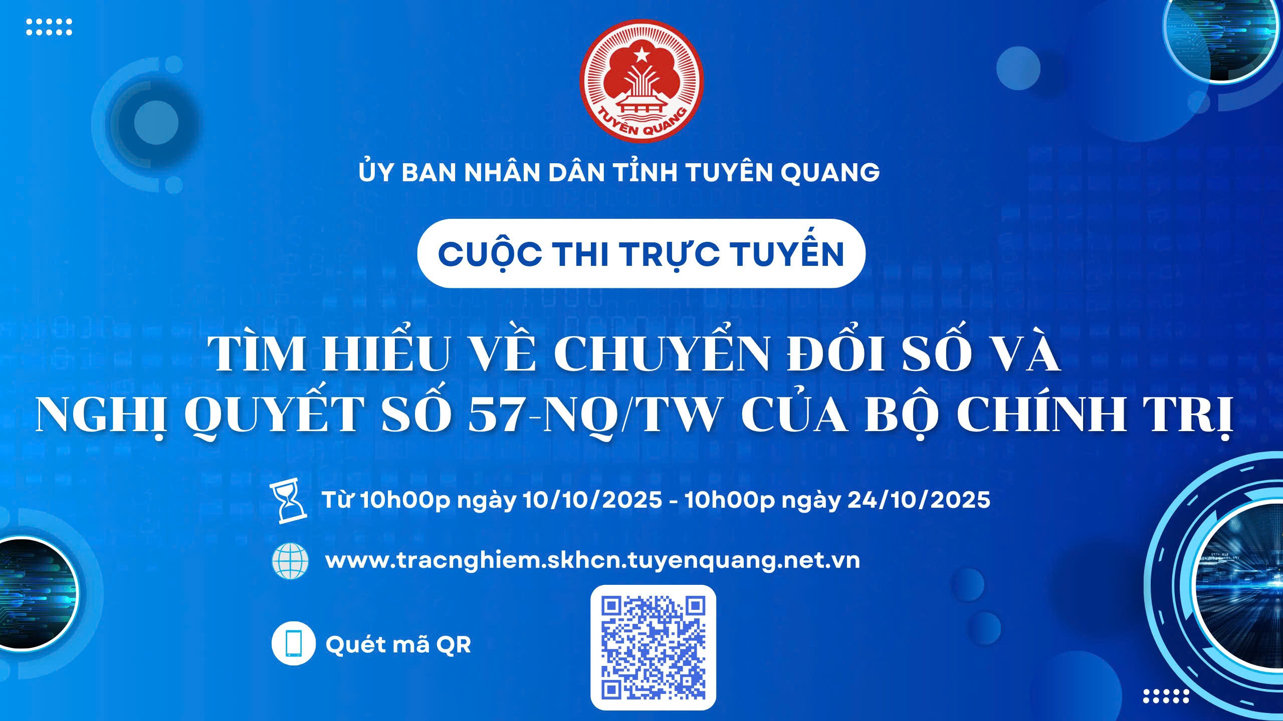Theo kế hoạch, cuộc thi được tổ chức bằng hình thức trắc nghiệm trực tuyến trên mạng Internet, thông qua địa chỉ: http://tracnghiem.skhcn.tuyenquang.net.vn; hoặc truy cập từ các banner “Cuộc thi trực tuyến Tìm hiểu về Chuyển đổi số và Nghị quyết số 57-NQ/TW” trên Cổng thông tin điện tử tỉnh và Trang thông tin điện tử của Sở Khoa học và Công nghệ.