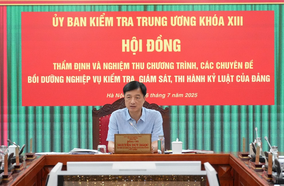 Trong các ngày 08, 15 và 16/7/2025, Ủy ban Kiểm tra Trung ương tổ chức Hội nghị nghiệm thu tài liệu bồi dưỡng nghiệp vụ kiểm tra, giám sát, thi hành kỷ luật của Đảng. Hội đồng nghiệm thu của Ủy ban Kiểm tra Trung ương gồm các đồng chí trong Thường trực Ủy ban, do đồng chí Nguyễn Duy Ngọc, Ủy viên Bộ Chính trị, Bí thư Trung ương Đảng, Chủ nhiệm Ủy ban Kiểm tra Trung ương làm Chủ tịch Hội đồng.