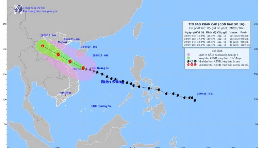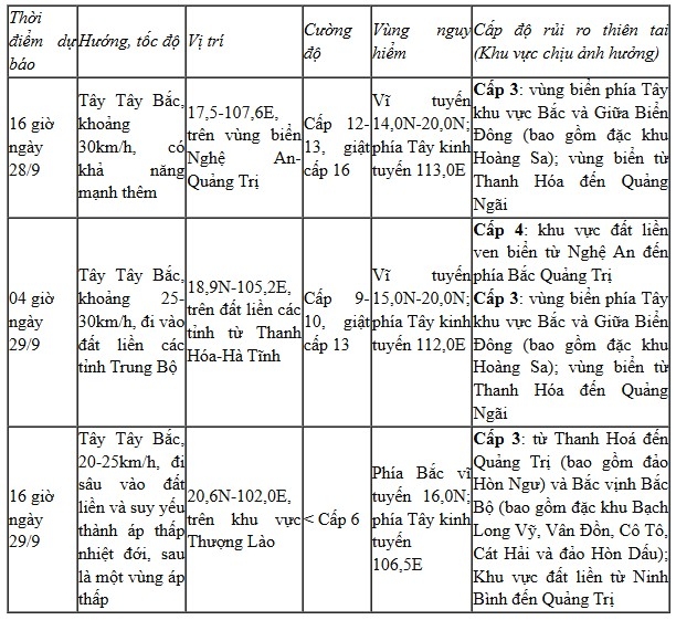 Hồi 4 giờ ngày 28/9, vị trí tâm bão ở vào khoảng 16,2 độ Vĩ Bắc; 110,2 độ Kinh Đông, trên vùng biển phía Tây đặc khu Hoàng Sa, cách Tp. Đà Nẵng khoảng 200km về phía Đông. Sức gió mạnh nhất vùng gần tâm bão mạnh cấp 12 (118-133km/giờ), giật cấp 15. Di chuyển theo hướng Tây Tây Bắc với tốc độ 30km/h.