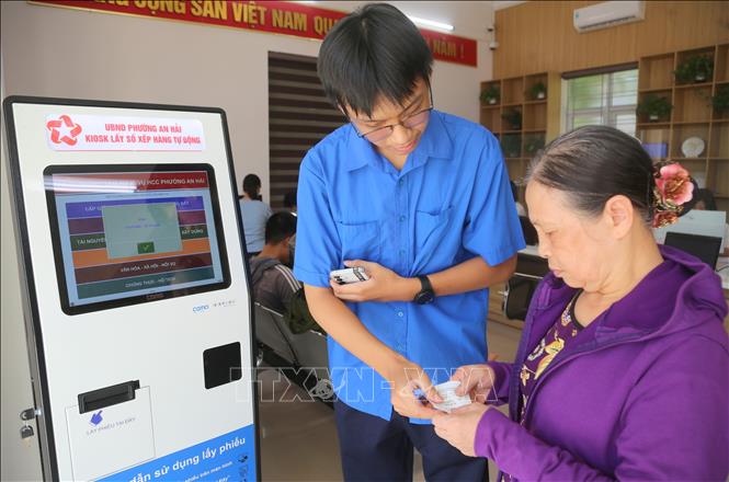 Thanh niên tình nguyện hỗ trợ người dân lấy số thứ tự phục vụ tại phường An Hải, thành phố Hải Phòng. Ảnh: Minh Thu/TTXVN