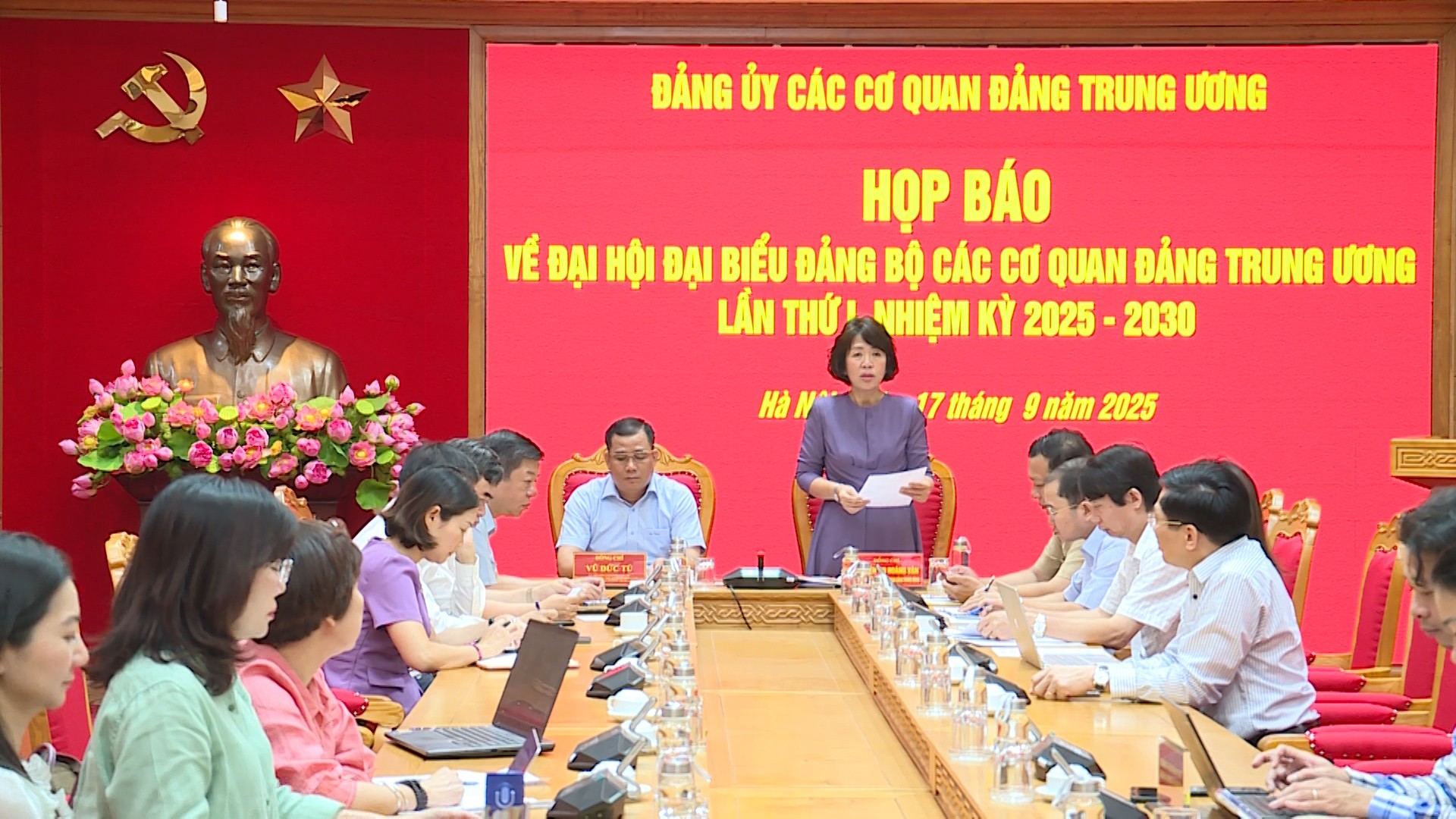 Sáng 17/9, tại Hà Nội, Đảng ủy các cơ quan Đảng Trung ương tổ chức họp báo công bố thông tin về Đại hội đại biểu Đảng bộ các cơ quan Đảng Trung ương lần thứ I, nhiệm kỳ 2025-2030. Đồng chí Nguyễn Thị Hoàng Vân, Phó bí thư Đảng ủy các cơ quan Đảng Trung ương, Trưởng Tiểu ban Tuyên truyền Đại hội và đồng chí Vũ Đức Tú, Ủy viên Ban Chấp hành Đảng bộ các cơ quan Đảng Trung ương, Phó trưởng ban Thường trực Ban Tuyên giáo và Dân vận Đảng ủy các cơ quan Đảng Trung ương, Phó trưởng Tiểu ban Thường trực Tiểu ban Tuyên truyền Đại hội chủ trì buổi họp báo.