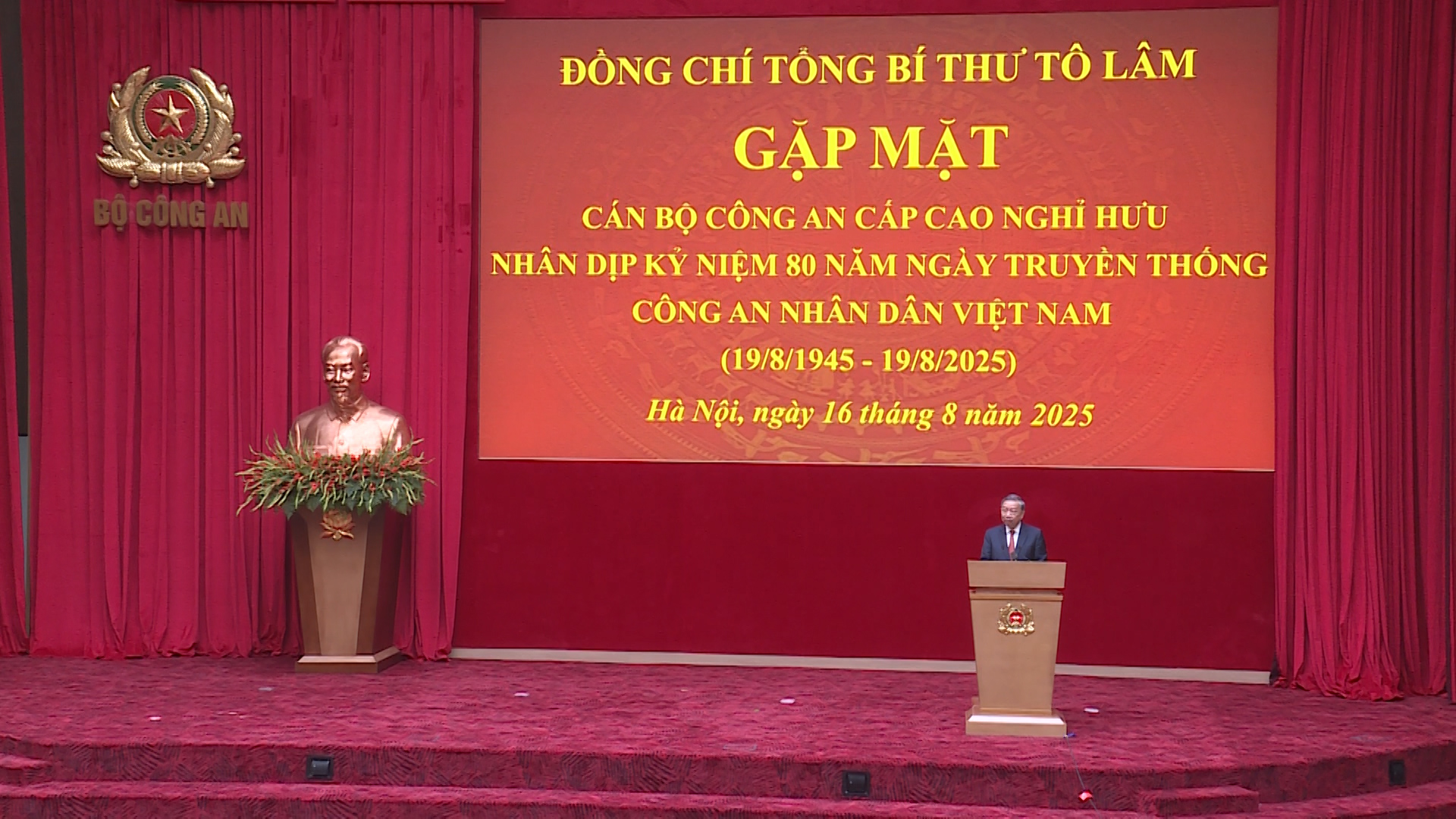 (ĐCSVN) - Nhân kỷ niệm 80 năm Ngày Cách mạng Tháng Tám (19/8/1945-19/8/2025), Quốc khánh nước Cộng hòa xã hội chủ nghĩa Việt Nam (2/9/1945- 2/9/2025) và 80 năm Ngày truyền thống Công an nhân dân (19/8/1945- 19/8/2025), 20 năm Ngày hội toàn dân bảo vệ an ninh Tổ quốc (19/8/2005 -19/8/2025), sáng 16/8, tại Hà Nội, Tổng Bí thư Tô Lâm đã gặp mặt cán bộ Công an cấp cao nghỉ hưu.