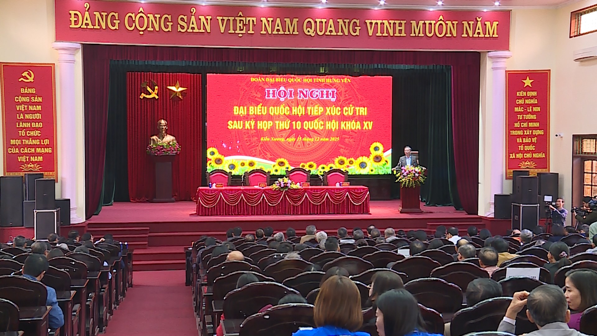 (ĐCSVN) - Chiều 15/12, tại xã Kiến Xương (tỉnh Hưng Yên), Tổng Bí thư Tô Lâm và các đại biểu Đoàn đại biểu Quốc hội tỉnh Hưng Yên đã tiếp xúc cử tri, thông báo kết quả Kỳ họp thứ 10, Quốc hội khóa XV và lắng nghe ý kiến, kiến nghị của cử tri. Dự hội nghị có các đồng chí: Phạm Gia Túc, Ủy viên Trung ương Đảng, Chánh Văn phòng Trung ương Đảng; Nguyễn Hữu Nghĩa, Ủy viên Trung ương Đảng, Bí thư Tỉnh ủy Hưng Yên; các đồng chí lãnh đạo tỉnh Hưng Yên; lãnh đạo các sở, ban, ngành của tỉnh và đại biểu cử tri 3 xã Kiến Xương, Lê Lợi, Quang Lịch.