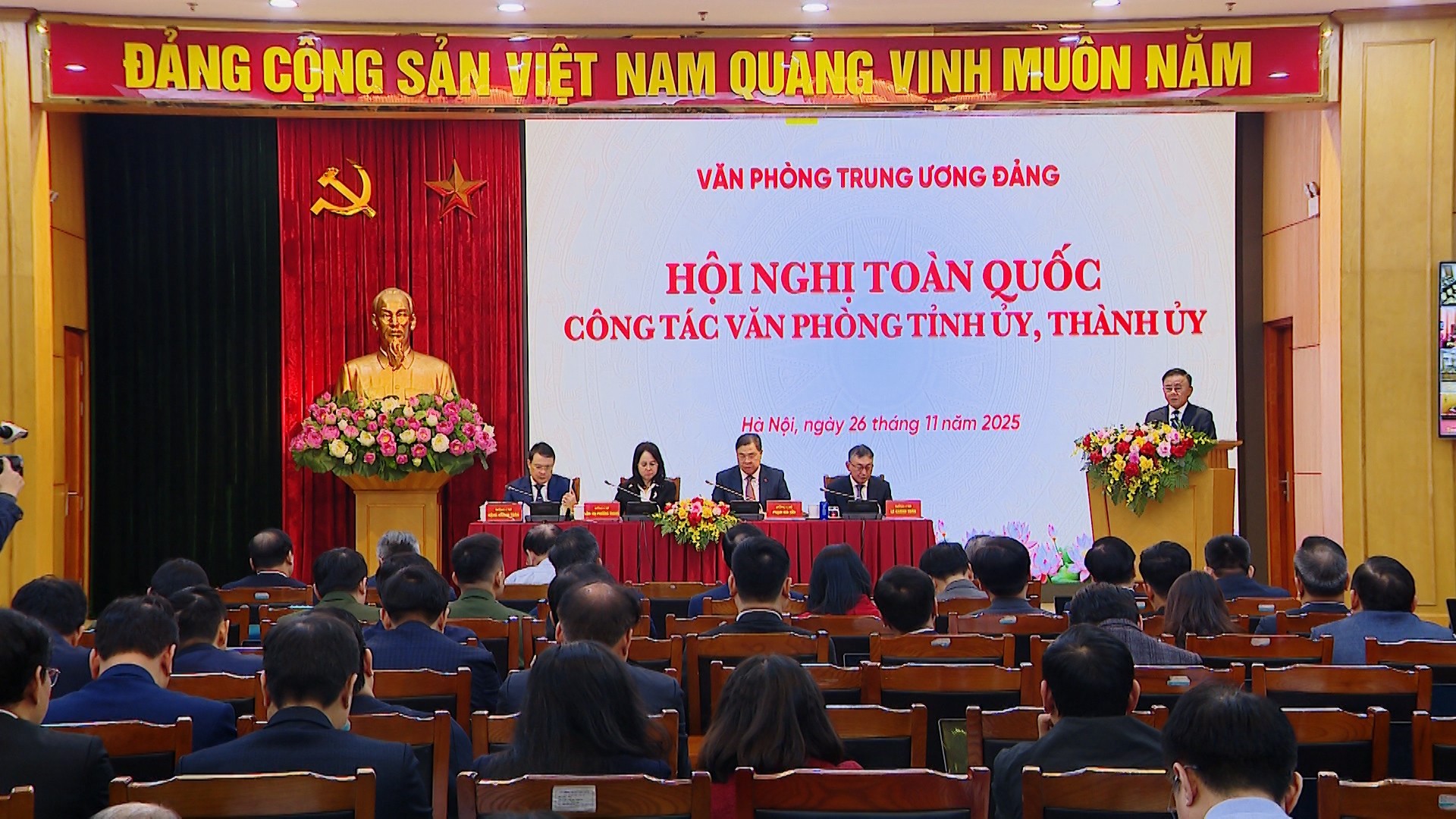 (ĐCSVN) - Sáng 26/11, Văn phòng Trung ương Đảng tổ chức Hội nghị toàn quốc công tác Văn phòng tỉnh ủy, thành ủy. Đồng chí Trần Cẩm Tú, Ủy viên Bộ Chính trị, Thường trực Ban Bí thư dự và phát biểu chỉ đạo tại Hội nghị. Đồng chí Phạm Gia Túc, Ủy viên Trung ương Đảng, Chánh Văn phòng Trung ương Đảng chủ trì Hội nghị.