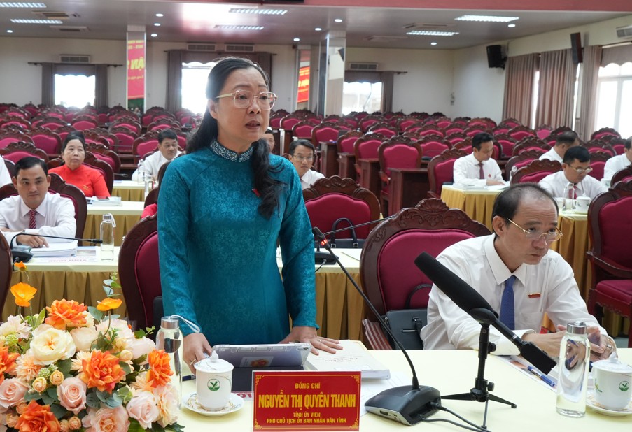 Phó Chủ tịch UBND tỉnh Nguyễn Thị Quyên Thanh thảo luận.