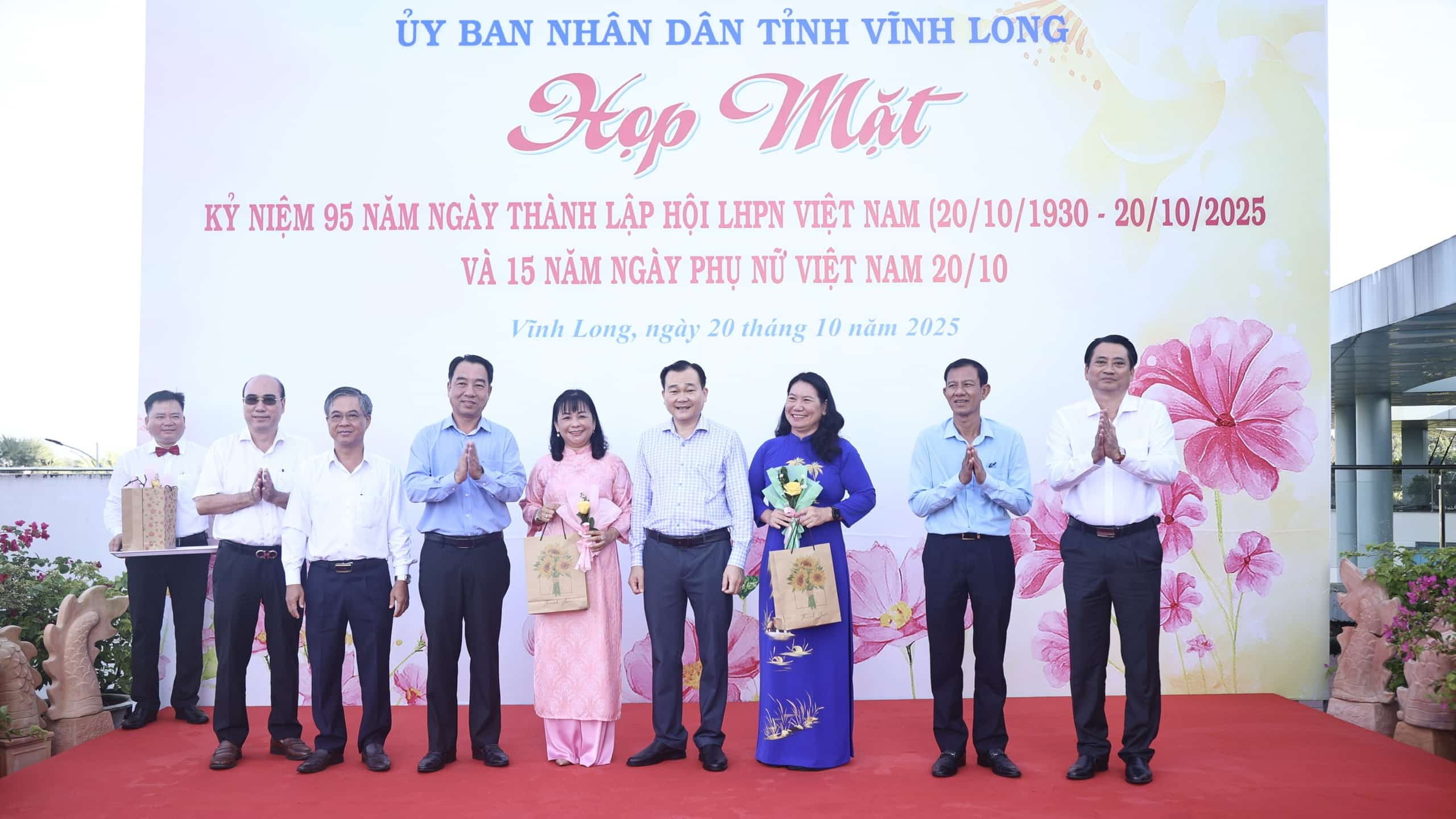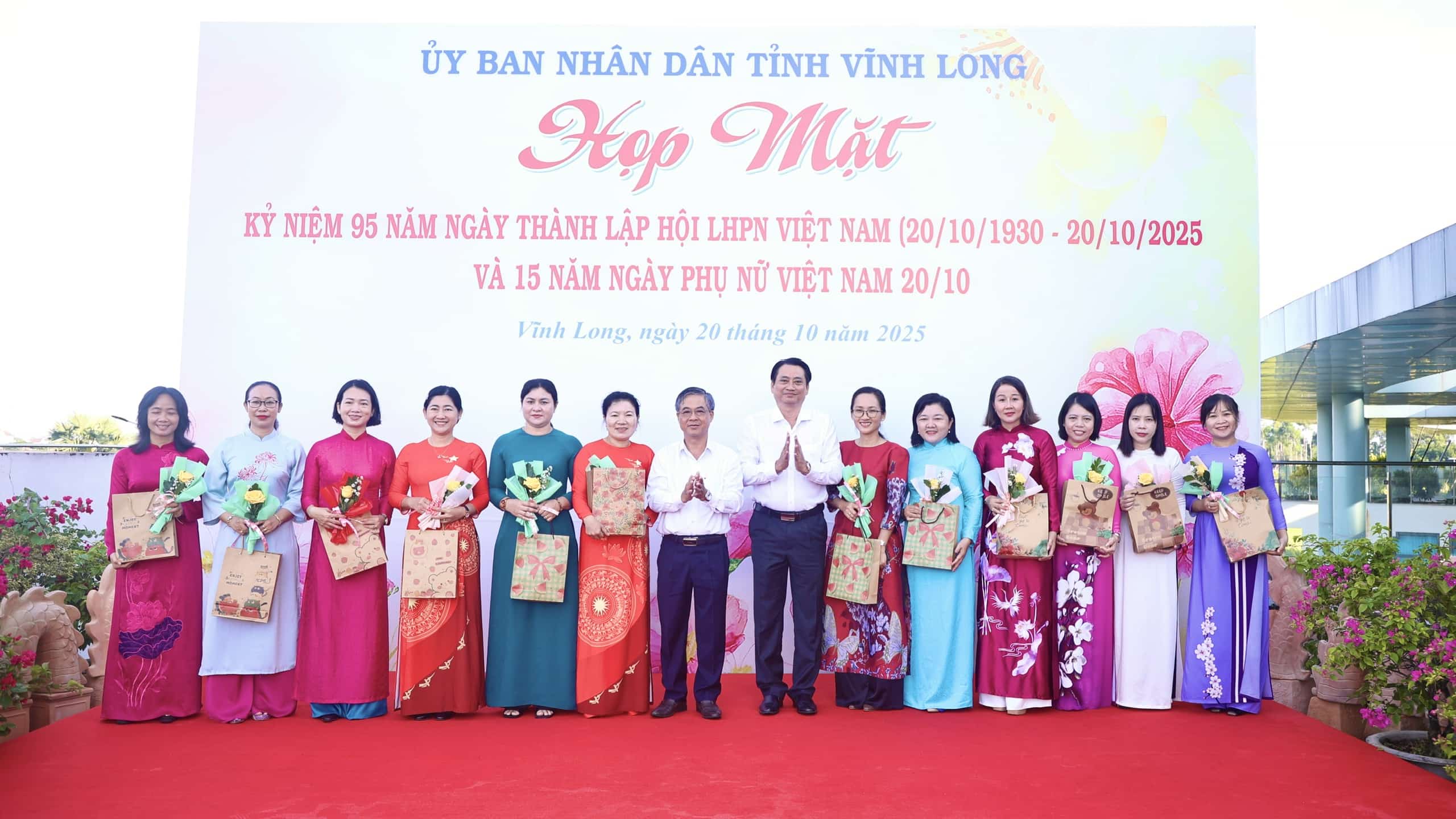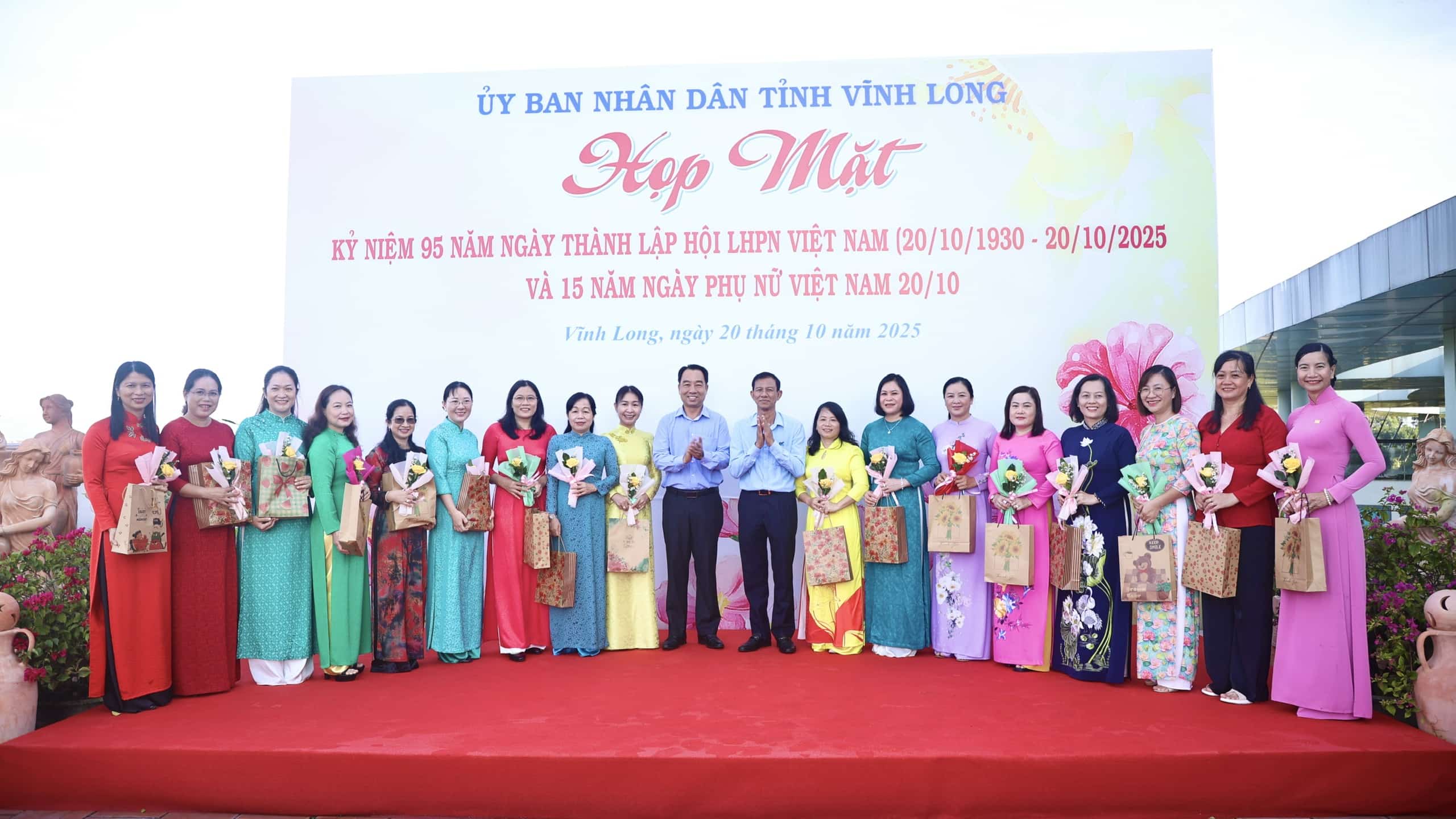 (Vinhlong.gov.vn) – Sáng ngày 20/10/2025, Thường trực UBND tỉnh Vĩnh Long tổ chức buổi họp mặt, tặng quà cho các đồng chí nữ cán bộ lãnh đạo chủ chốt của tỉnh nhân dịp Kỷ niệm 95 năm ngày thành lập Hội LHPN Việt Nam (20/10/1930-20/10/2025) và ngày Phụ nữ Việt Nam 20/10.