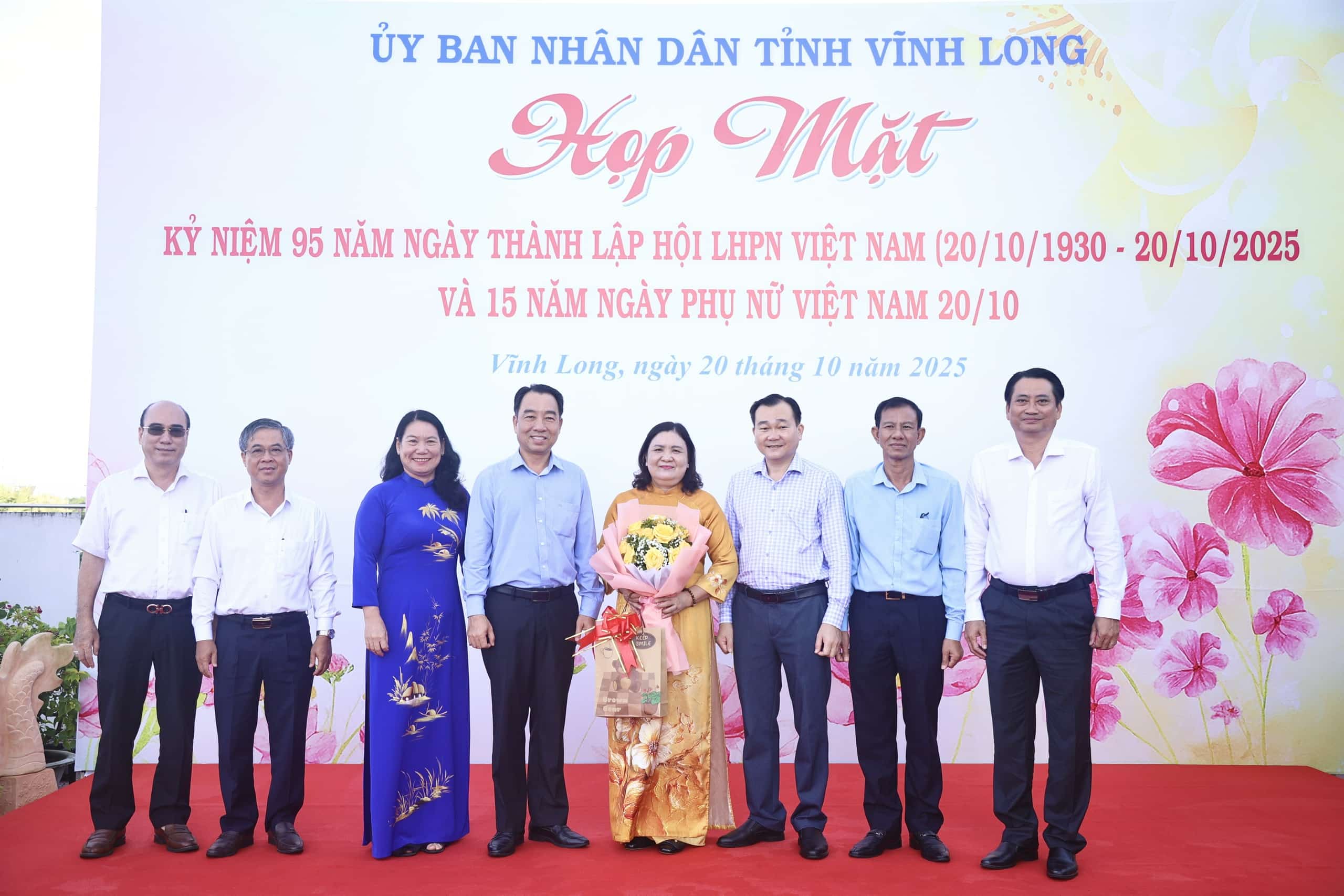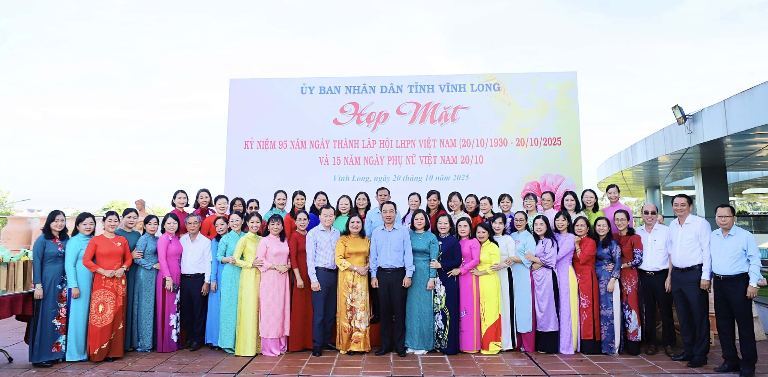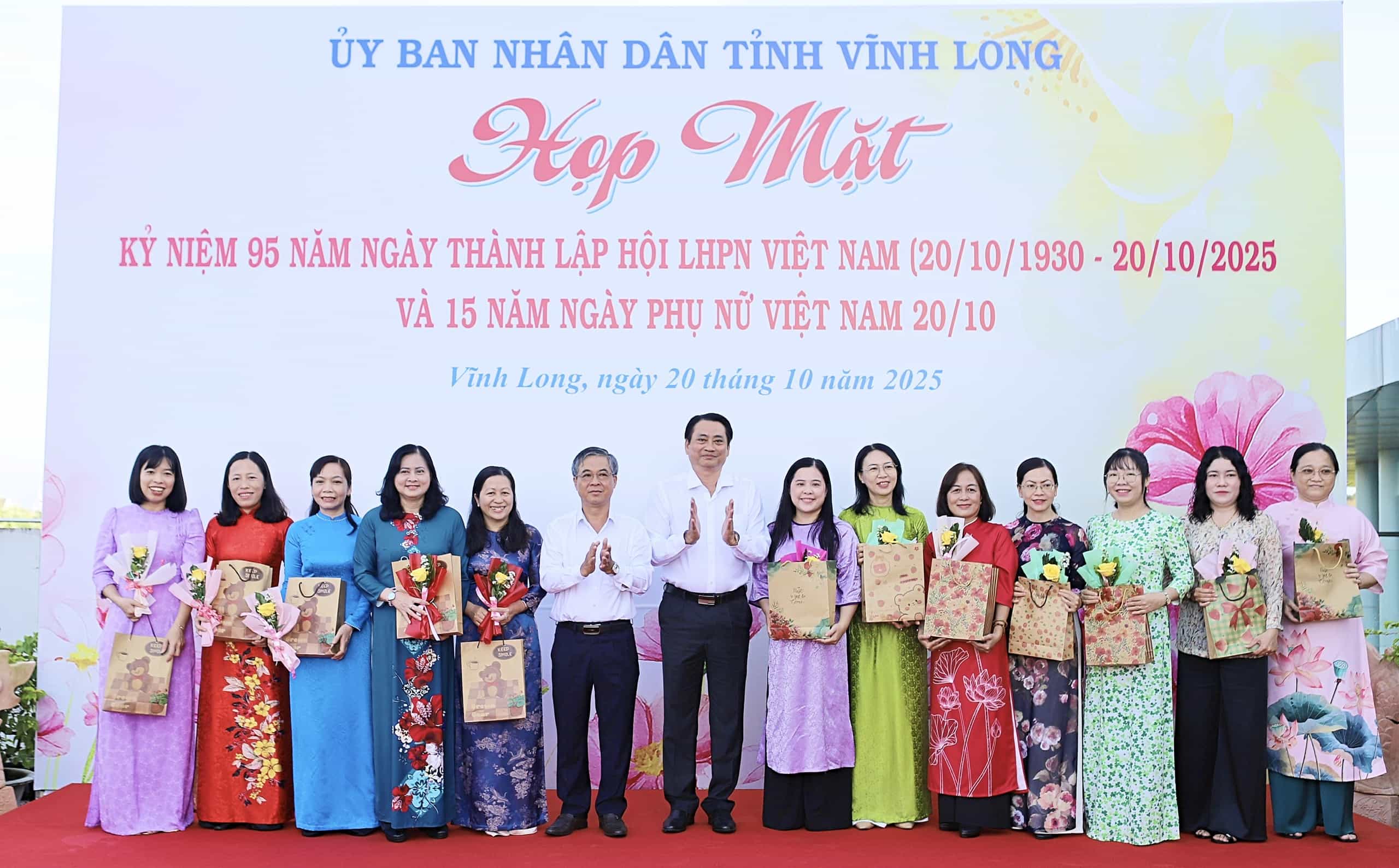 (Vinhlong.gov.vn) – Sáng ngày 20/10/2025, Thường trực UBND tỉnh Vĩnh Long tổ chức buổi họp mặt, tặng quà cho các đồng chí nữ cán bộ lãnh đạo chủ chốt của tỉnh nhân dịp Kỷ niệm 95 năm ngày thành lập Hội LHPN Việt Nam (20/10/1930-20/10/2025) và ngày Phụ nữ Việt Nam 20/10.