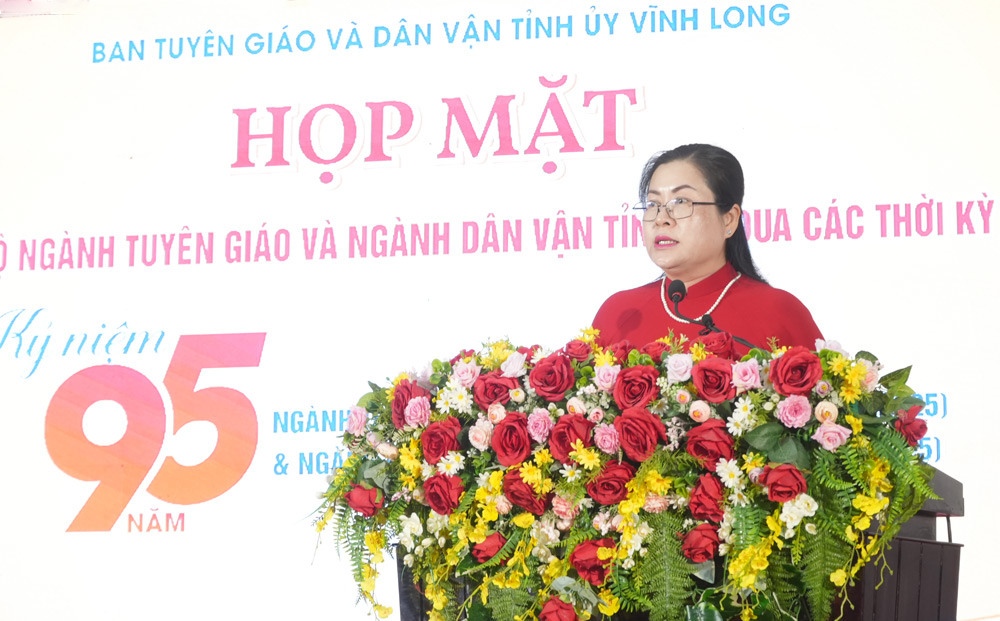 Tại buổi họp mặt, Trưởng Ban Tuyên giáo và Dân vận Tỉnh ủy Nguyễn Thị Minh Trang đã ôn lại truyền thống 95 năm hình thành và phát triển của ngành, khẳng định vai trò đặc biệt quan trọng của công tác tuyên giáo và dân vận trong sự nghiệp cách mạng của Đảng và dân tộc. Qua từng giai đoạn, đội ngũ cán bộ ngành Tuyên giáo và Dân vận đã luôn kiên trung, bám sát thực tiễn, đóng góp tích cực vào công cuộc xây dựng Đảng, củng cố khối đại đoàn kết toàn dân tộc, phát huy sức mạnh nhân dân trong công cuộc xây dựng và bảo vệ Tổ quốc.