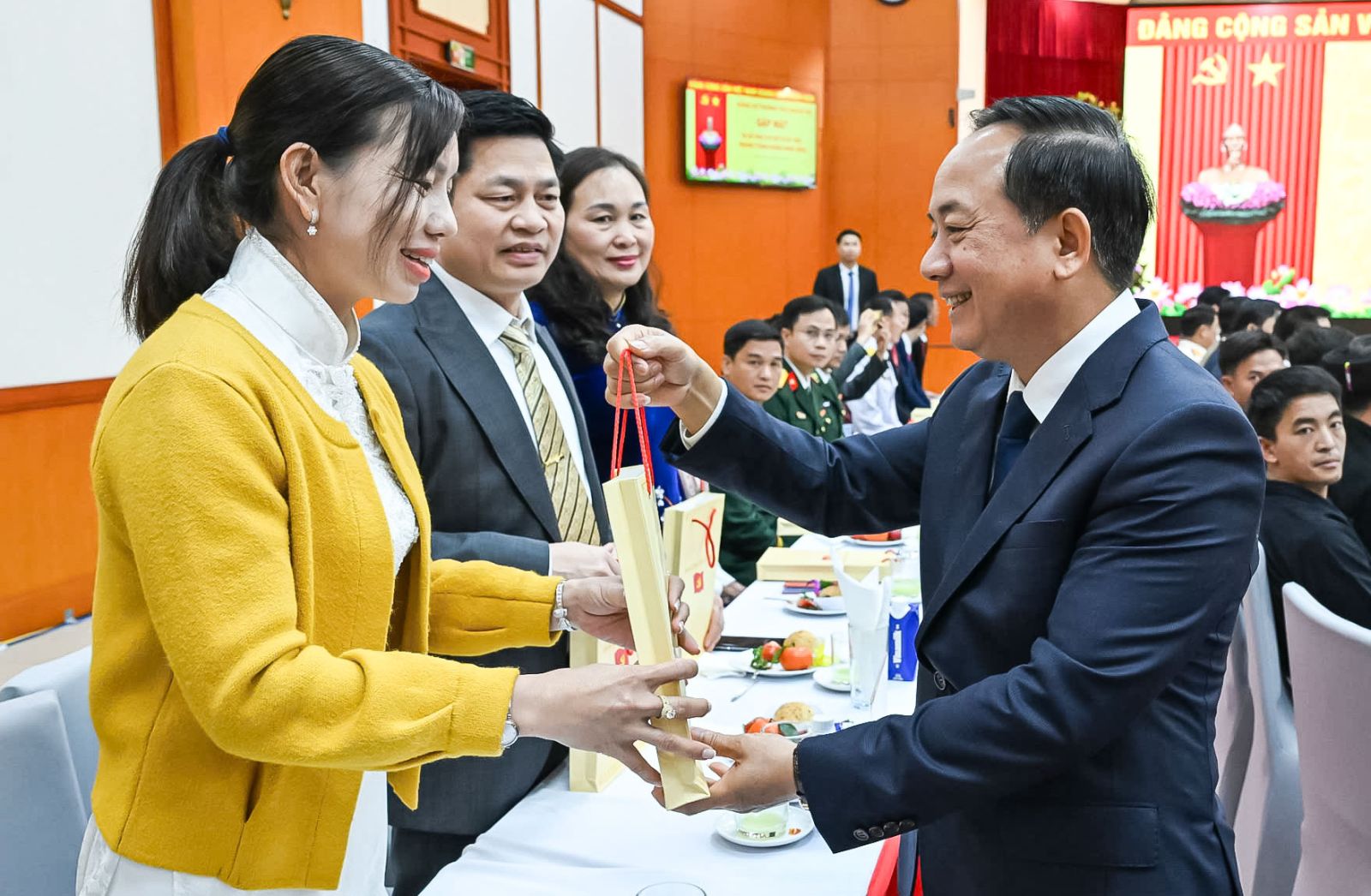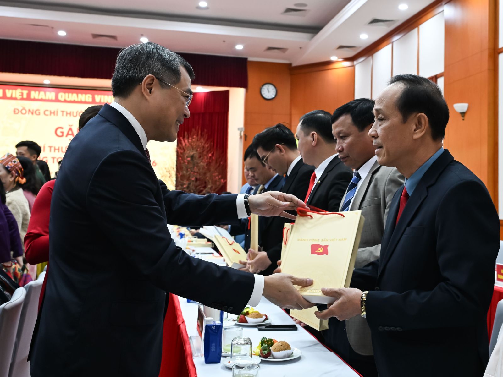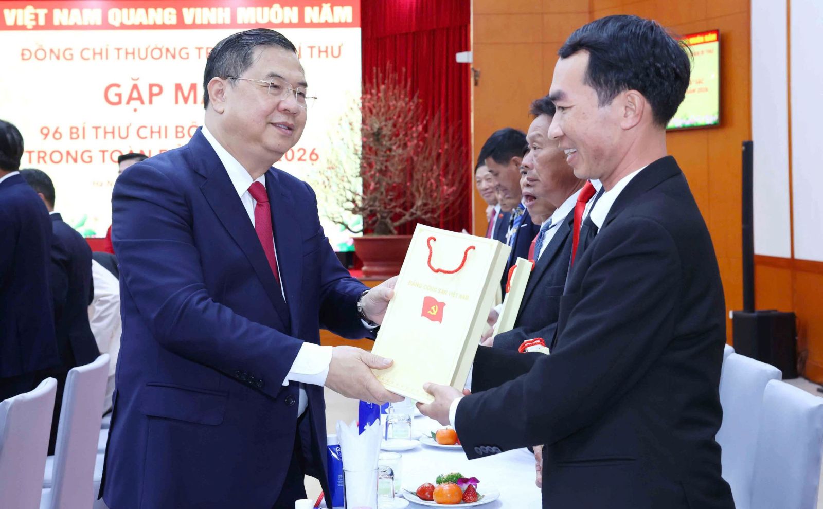 Đồng chí Lê Minh Hưng, Ủy viên Bộ Chính trị, Bí thư Trung ương Đảng,Trưởng Ban Tổ chức Trung ương trao quà tặng các Bí thư chi bộ xuất sắc tại buổi gặp mặt.
