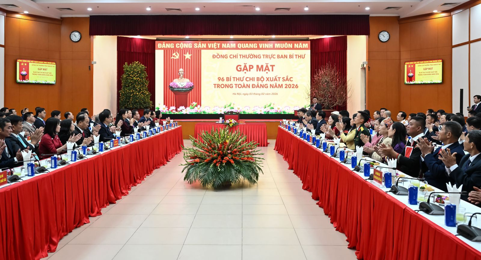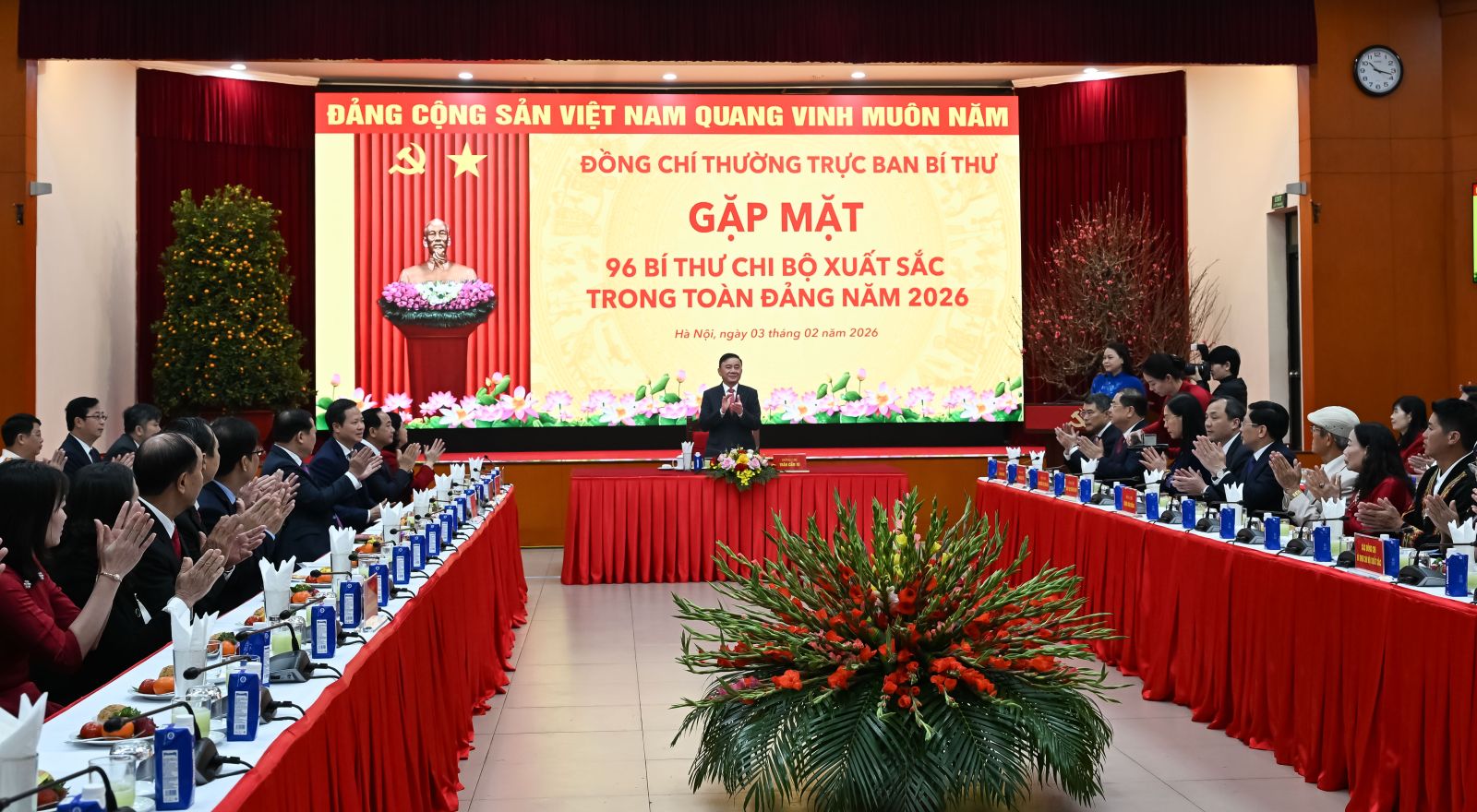 (ĐCSVN) - Sáng 3/2, tại Hà Nội, đồng chí Trần Cẩm Tú, Ủy viên Bộ Chính trị, Thường trực Ban Bí thư chủ trì buổi gặp mặt 96 Bí thư chi bộ xuất sắc trong toàn Đảng năm 2026. Dự gặp mặt có các đồng chí Ủy viên Bộ Chính trị, Bí thư Trung ương Đảng: Lê Minh Hưng, Trưởng Ban Tổ chức Trung ương; Bùi Thị Minh Hoài, Chủ tịch Ủy ban Trung ương Mặt trận Tổ quốc Việt Nam; Trịnh Văn Quyết, Trưởng Ban Tuyên giáo và Dân vận Trung ương; Phạm Gia Túc, Chánh Văn phòng Trung ương Đảng.
