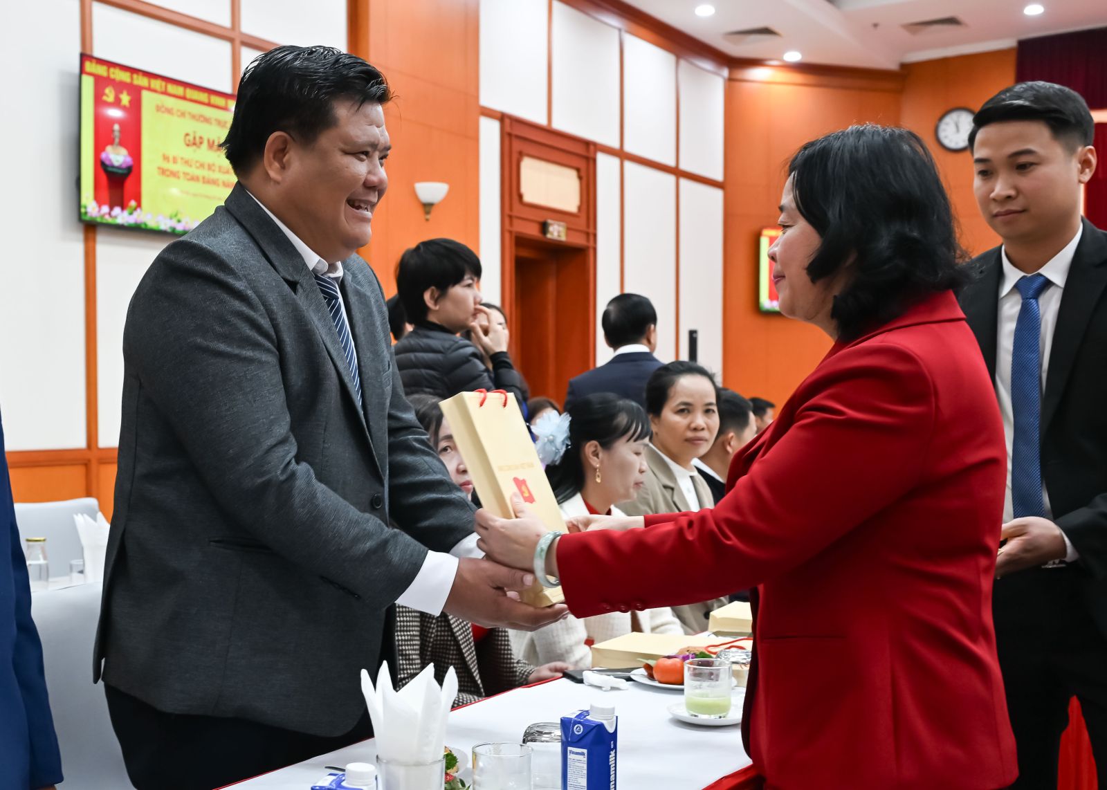 Đồng chí Bùi Thị Minh Hoài, Ủy viên Bộ Chính trị, Bí thư Trung ương Đảng, Chủ tịch Ủy ban Trung ương Mặt trận Tổ quốc Việt Nam trao quà tặng các Bí thư chi bộ xuất sắc tại buổi gặp mặt.