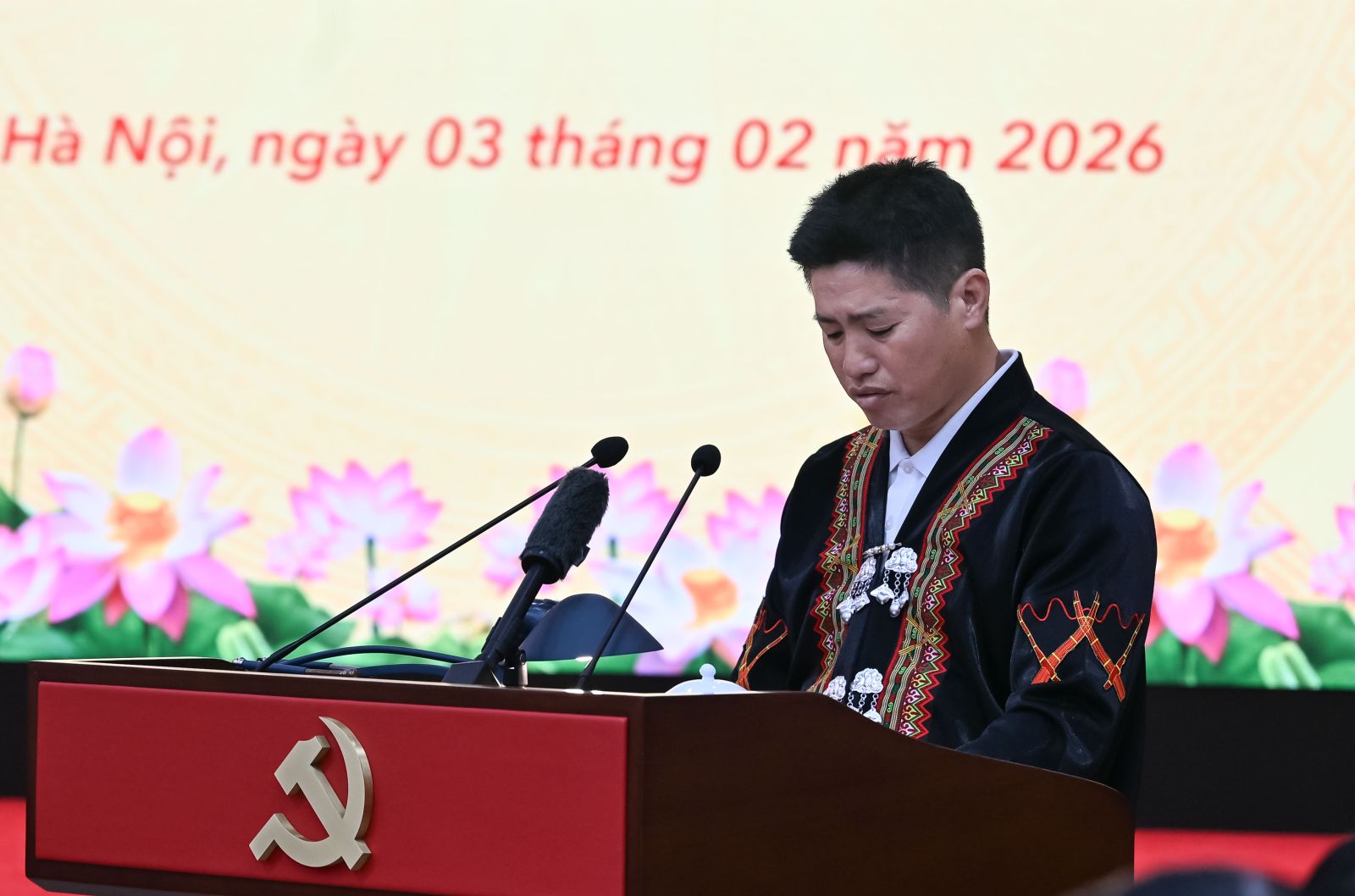 Đồng chí Vàng A Chứ, Bí thư chi bộ Bản Há Là Chủ B, xã Pa Ham, tỉnh Điện Biên phát biểu tại buổi gặp mặt.