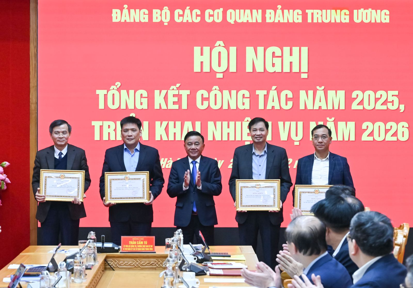 Đồng chí Trần Cẩm Tú, Ủy viên Bộ Chính trị, Thường trực Ban Bí thư, Bí thư Đảng ủy các cơ quan Đảng Trung ương trao Bằng khen tặng các Đảng bộ trực thuộc hoàn thành xuất sắc nhiệm vụ năm 2025.