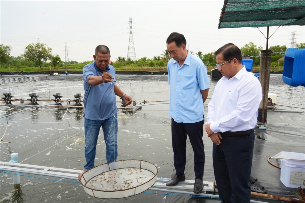 Chủ tịch UBND tỉnh Lữ Quang Ngời (giữa) khảo sát tại khu nuôi tôm công nghệ cao Tám Thượng (ấp Tân Hòa).