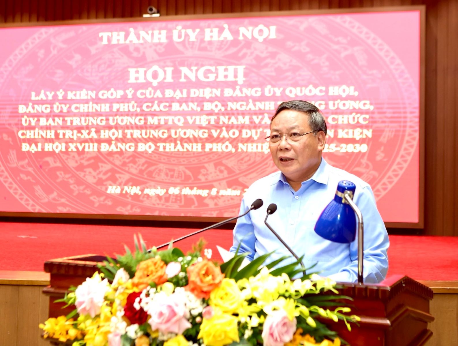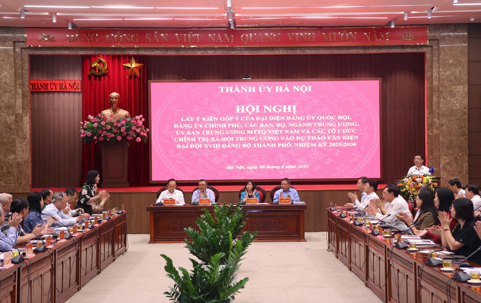 (ĐCSVN) - Chiều 6/8, tại trụ sở Thành ủy Hà Nội, Ban Thường vụ Thành ủy tổ chức hội nghị lấy ý kiến góp ý của đại diện Đảng ủy Quốc hội, Đảng ủy Chính phủ, các ban, bộ, ngành, Ủy ban Trung ương Mặt trận Tổ quốc Việt Nam và các tổ chức chính trị - xã hội Trung ương vào Dự thảo văn kiện Đại hội XVIII Đảng bộ thành phố Hà Nội, nhiệm kỳ 2025-2030.